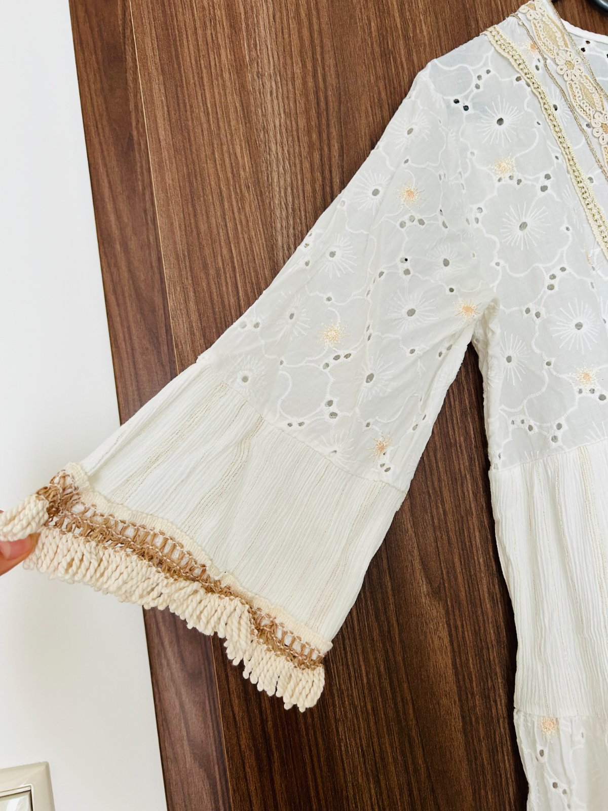 Predám tieto nádherné boho šaty kupované v talianskom butiku v univerzálnej veľkosti. Šaty sú v top stave, oblečené boli asi len 2x. Šaty majú prvky madeiry aj boho štýlu, sú ľahké a vzdušné, ideálne na leto. Majú podšívku, takže nie sú ani priesvitné. Rozmery: dĺžka: 86cm, šírka v podpazuší v kľude 47cm, natiahne sa do šírky 52cm.
