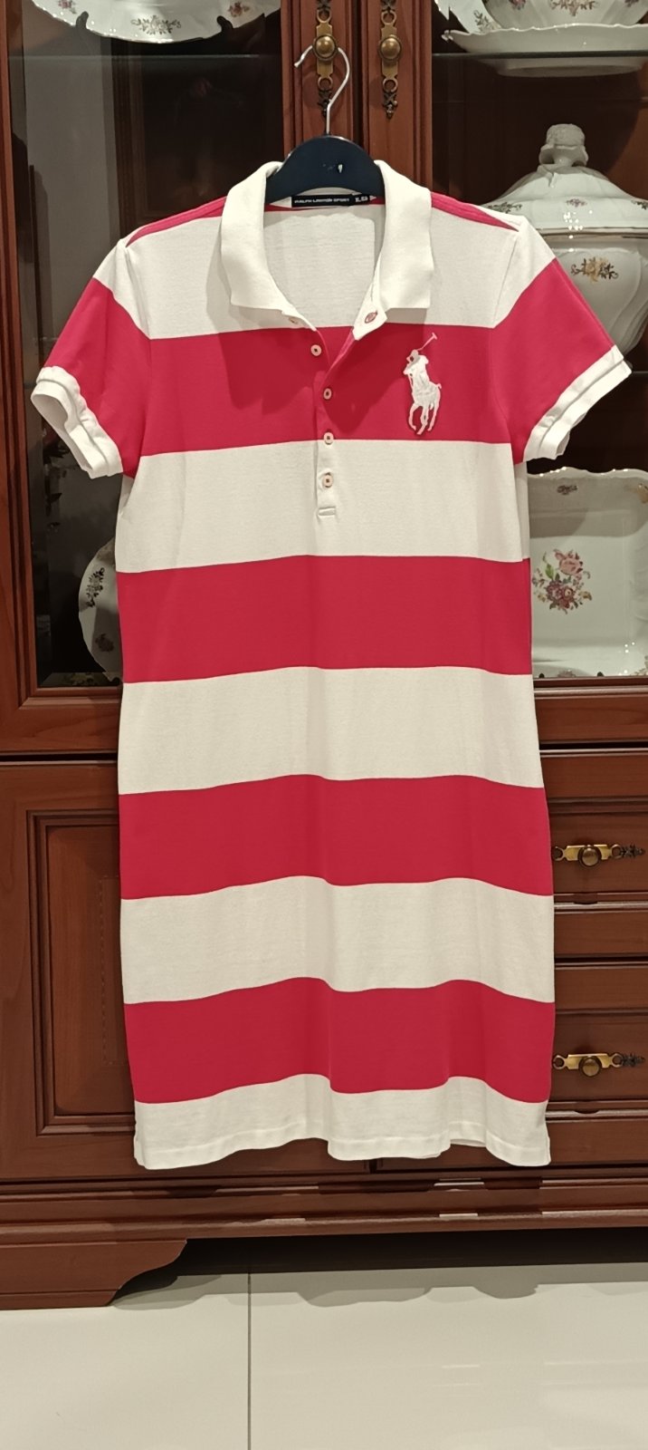 Veľmi pohodlné tričkove šaty zo 100% bavlny, biela s jasno červenou, úplet je prispôsobivý a pekne drží tvar, dole po bokoch malé rozparky cca 3 cm, super stav, nosila som ako M/ L kvôli výške a aby mi boli voľné po bokoch bez obtiahnutia.