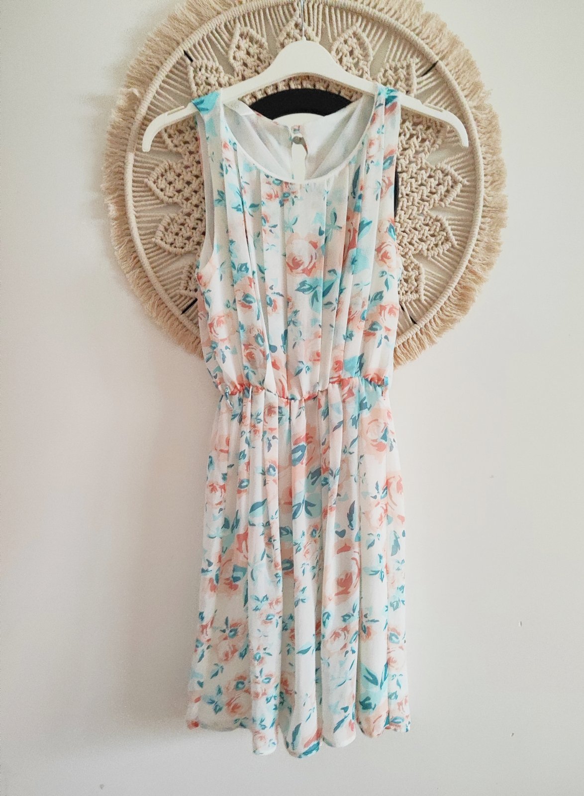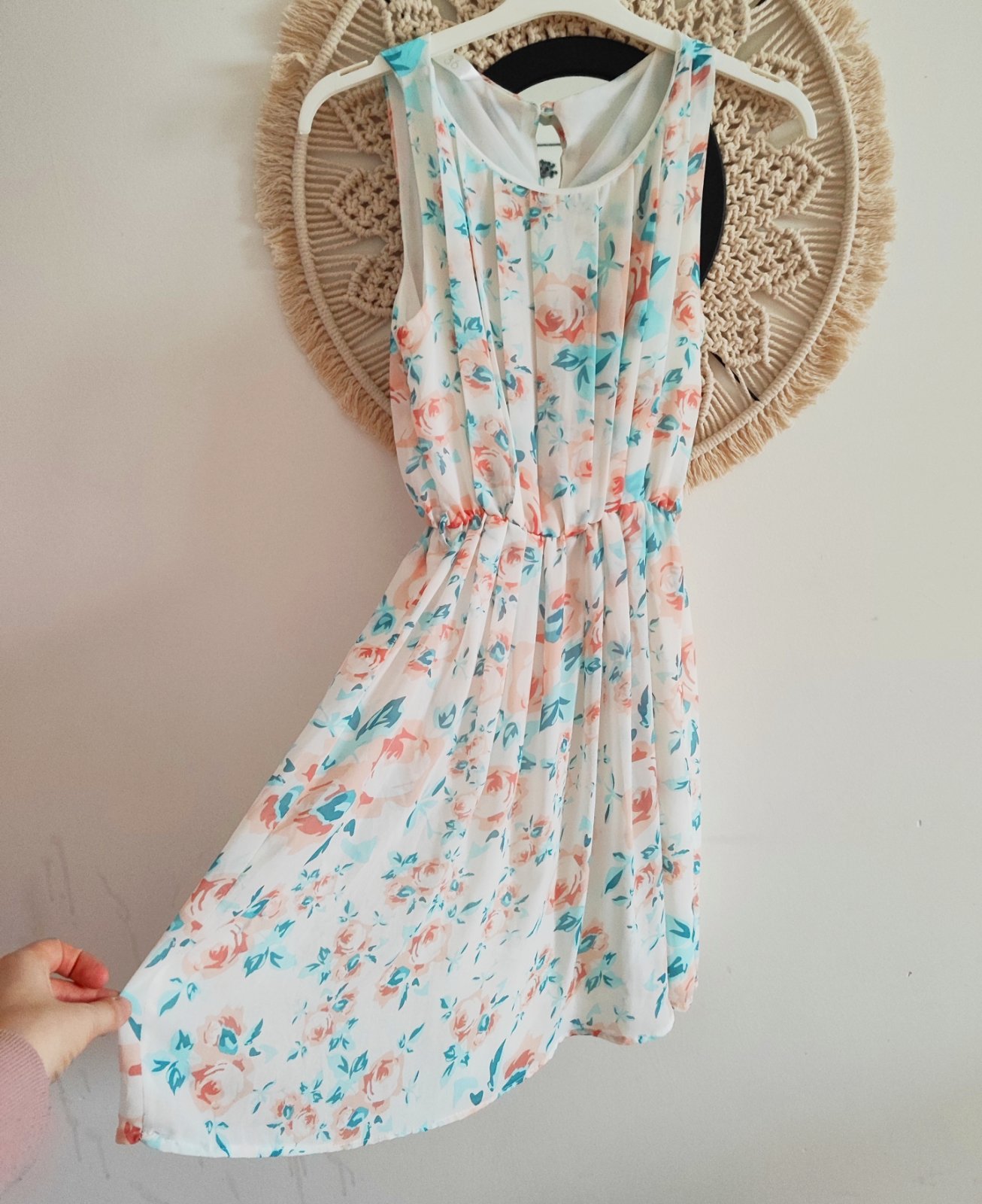 Kvetovane mini saty Reserved, ackovy strih, na ramenach tmavomodre stuhy na viazanie. Funkcne vrecka na oboch stranach. Stitok nemaju, ale material je bavlna, nepresvitaju. Na stitku velkost XS, al...