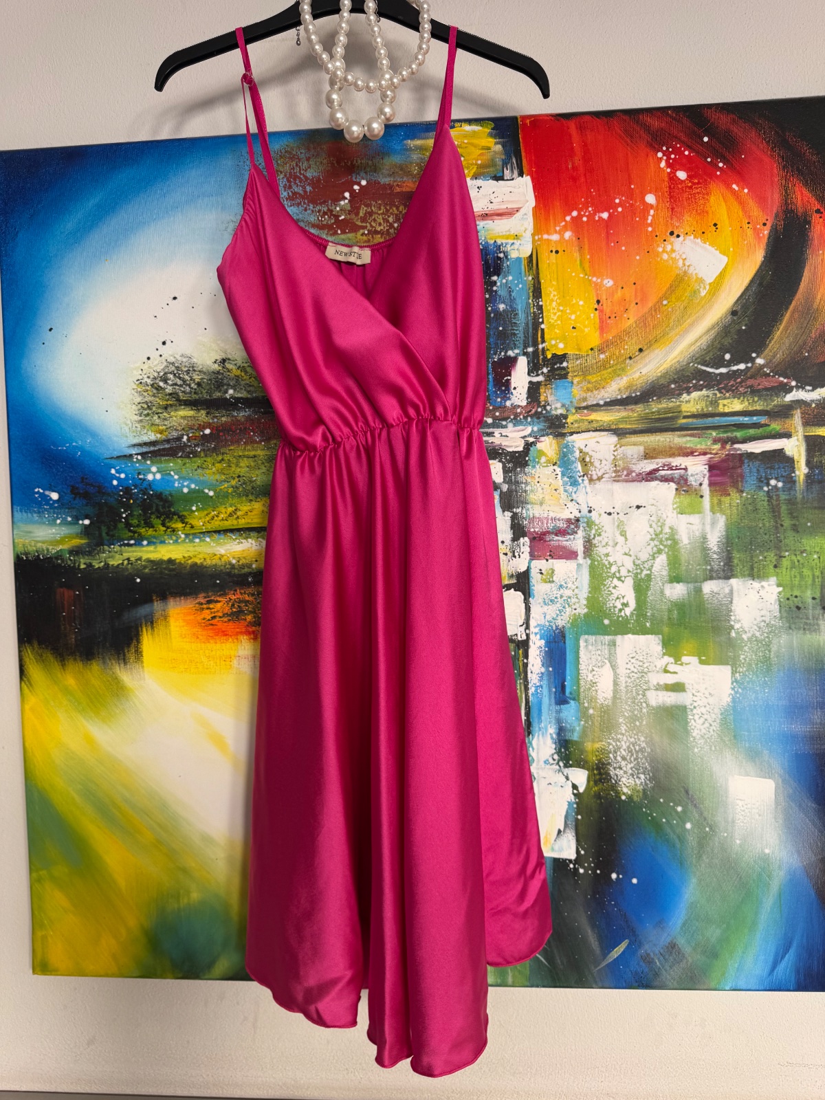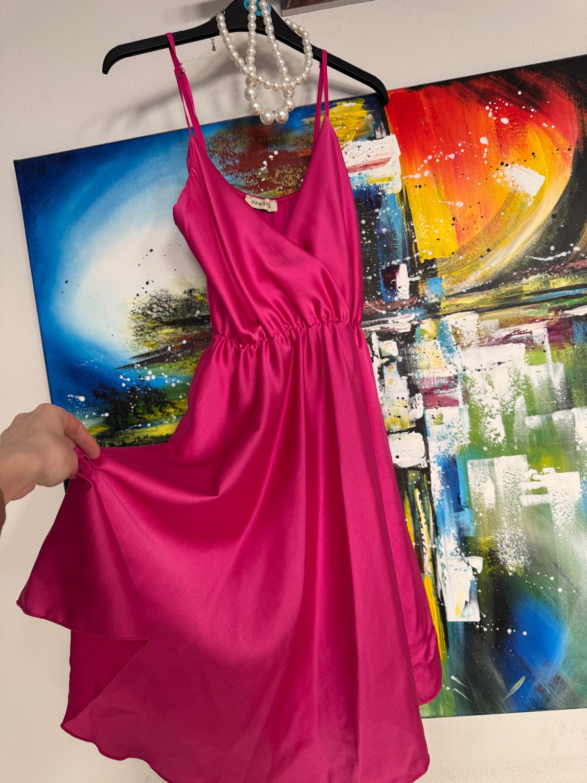 Ružovo červená intenzívna farba, pár krát oblečené, veľmi dobre ukážu na postave, zakryjú bruško, lichotivý strih, všitá gumička. Nosila som pri výške 163cm a váhe cca 68kg.