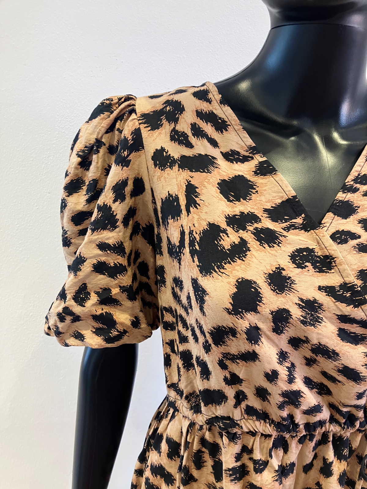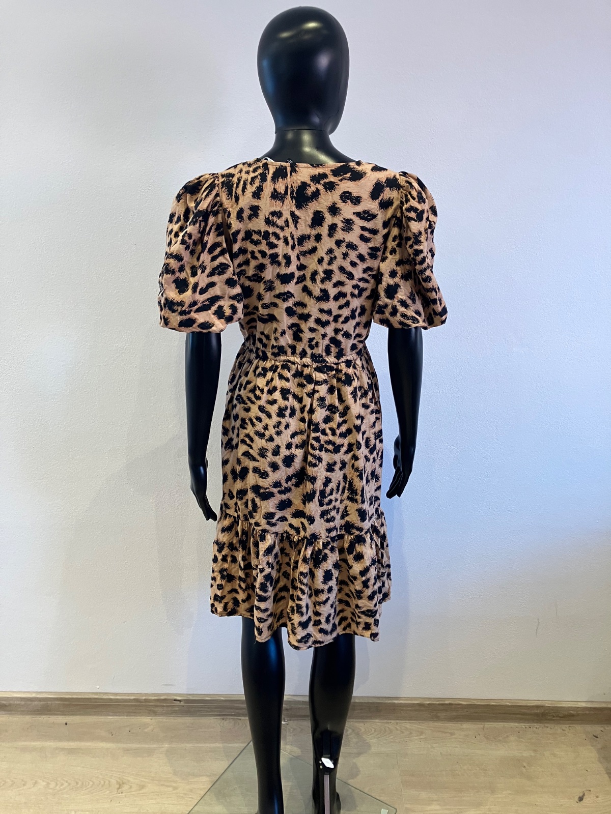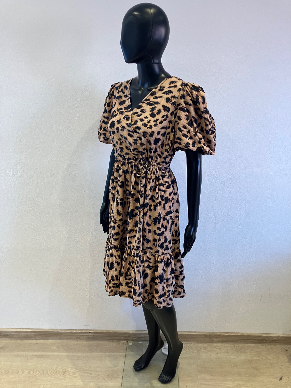 Dámske leopardie šaty s krátkymi puff rukávmi, nie sú elastické, zaväzovanie na páse, oversize, materiál 85%viskóza 15%polyamid.