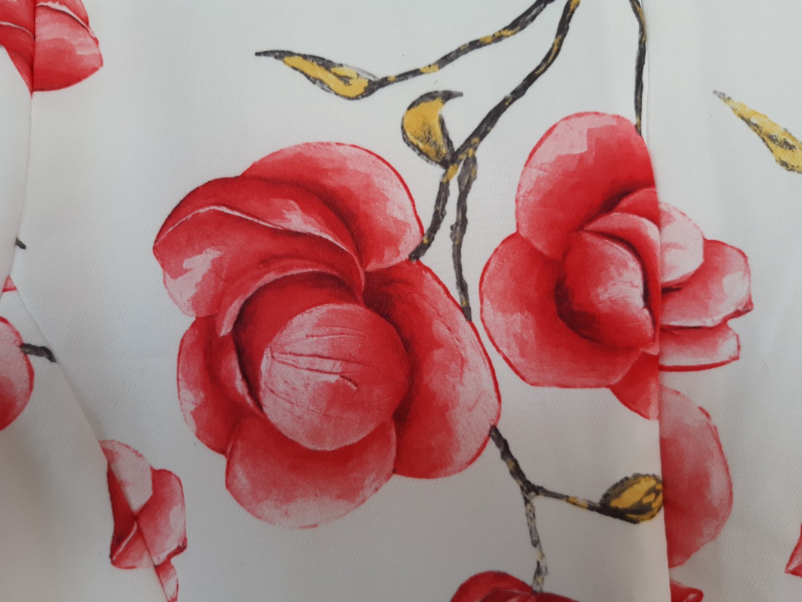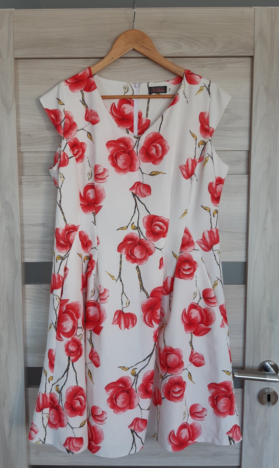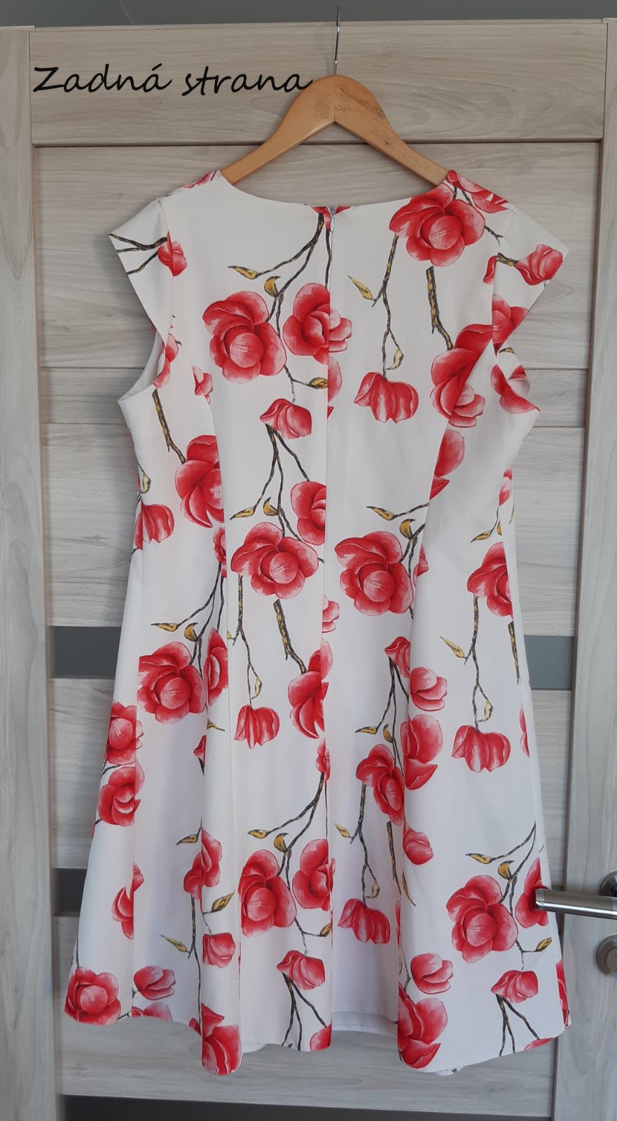 Elegantné dámske šaty vo veľmi dobrom nosenom stave (bez dierok a fliačikov, sem-tam žmolky). Šaty majú klasický áčkový strih, dve otvorené bočné vrecká, zips na zadnej strane. Materiál: polyester, elastan (odstrihnutý vnútorný štítok). Značka: ELMEMA; veľkosť: 44.