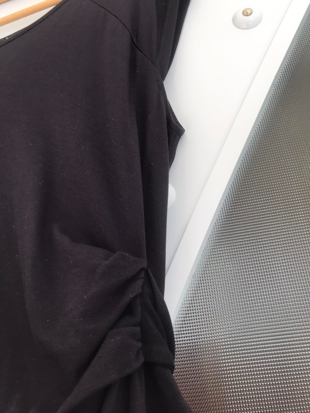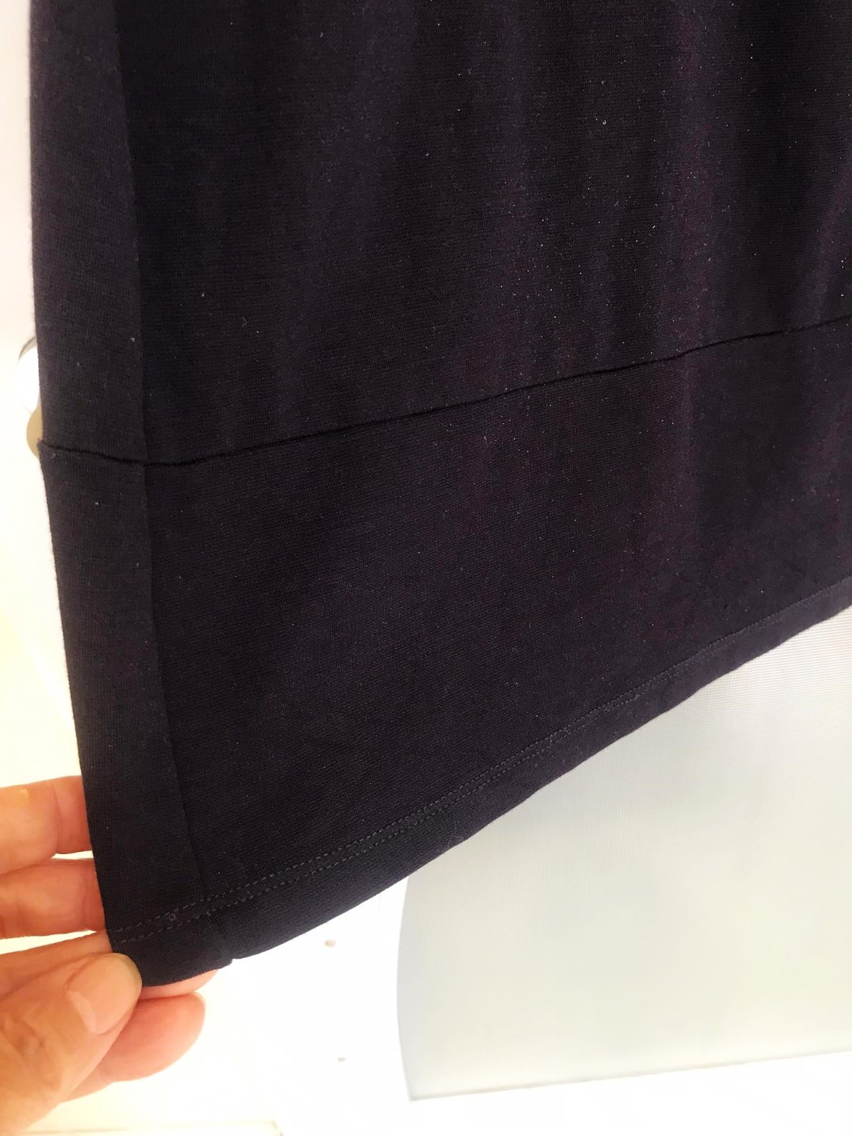 dlžka celkom = 98 cm,ramená = 13,5 cm, šírka pod pazuchou = 44 cm x 2 ( poddá sa,materiál je pružný ),farba je medzi temnou tmavomodrou až čiernou - ťažko rozoznať,zloženie : 73 % viskóza,23 % polyester,4% elastan