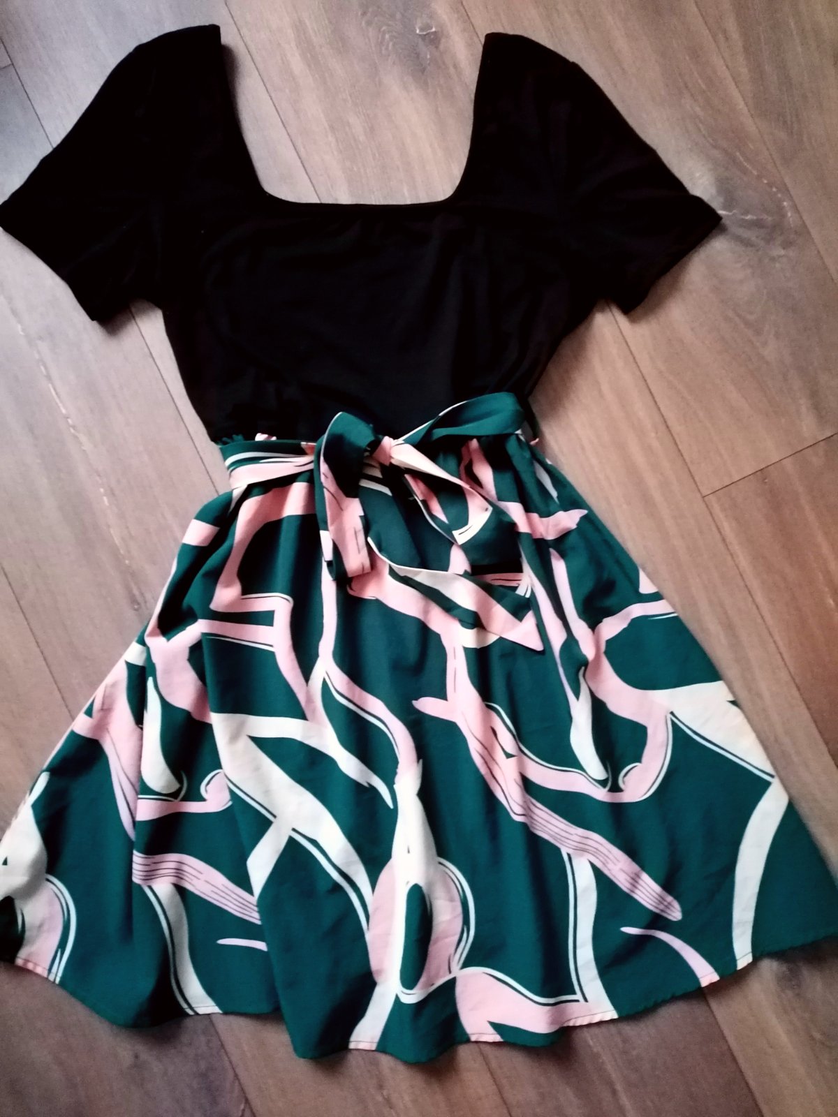 Nádherné letné šaty, vrch tričkovina, lodičkový výstrih spodok asi viskóza (nekrčia sa skoro vôbec), v páse opasok. Sú zo Shein, veľkosť som nenasla udanú ale ja som nosila ako 38 a sedeli pekne. Ľahké, ideálne na leto. Dĺžka od krku po spodok 85 cm, šírka v prsiach 44 cm.