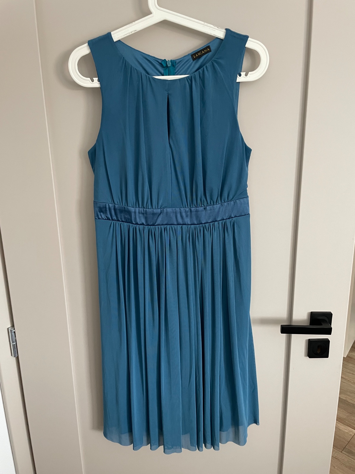 Elegantné šaty v jasnej belasomodrej farbe. Dajú sa nosiť na voľno, alebo prepásané. Opasok nie je k šatám originál, je iba ilustračný. Šaty majú podšívku, nepresvitajú. V super stave, bez poškoden...