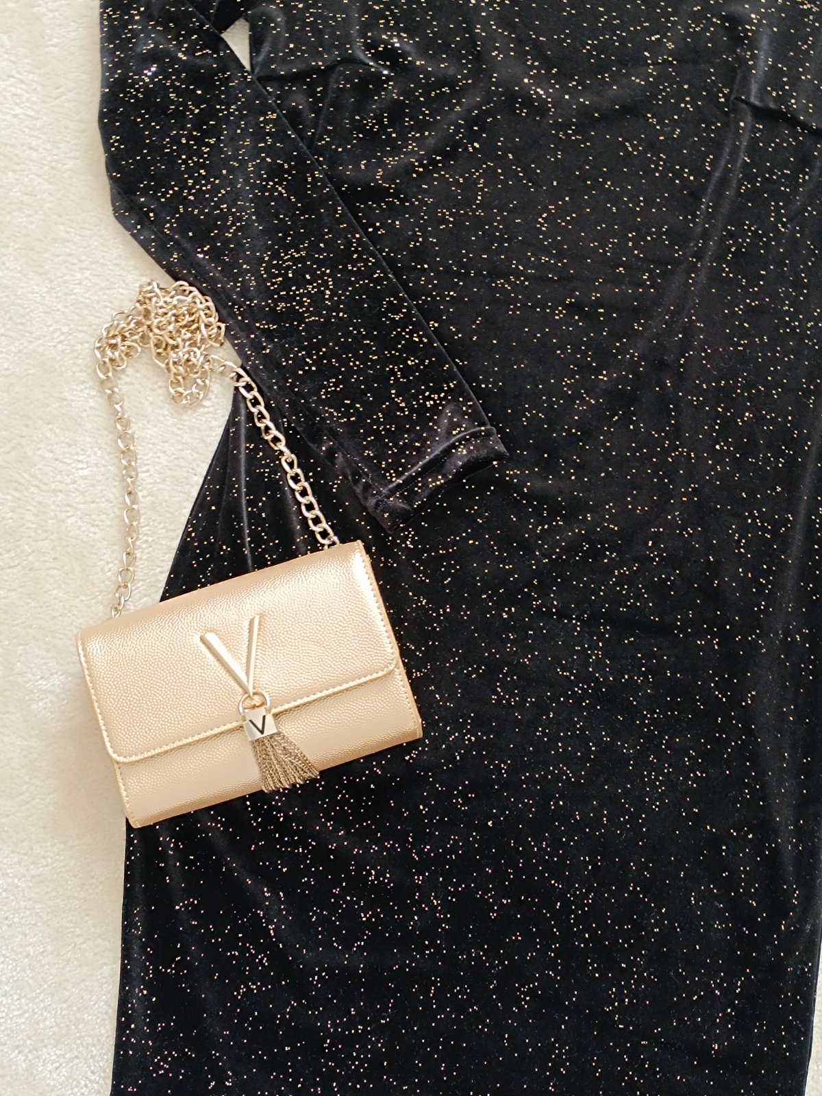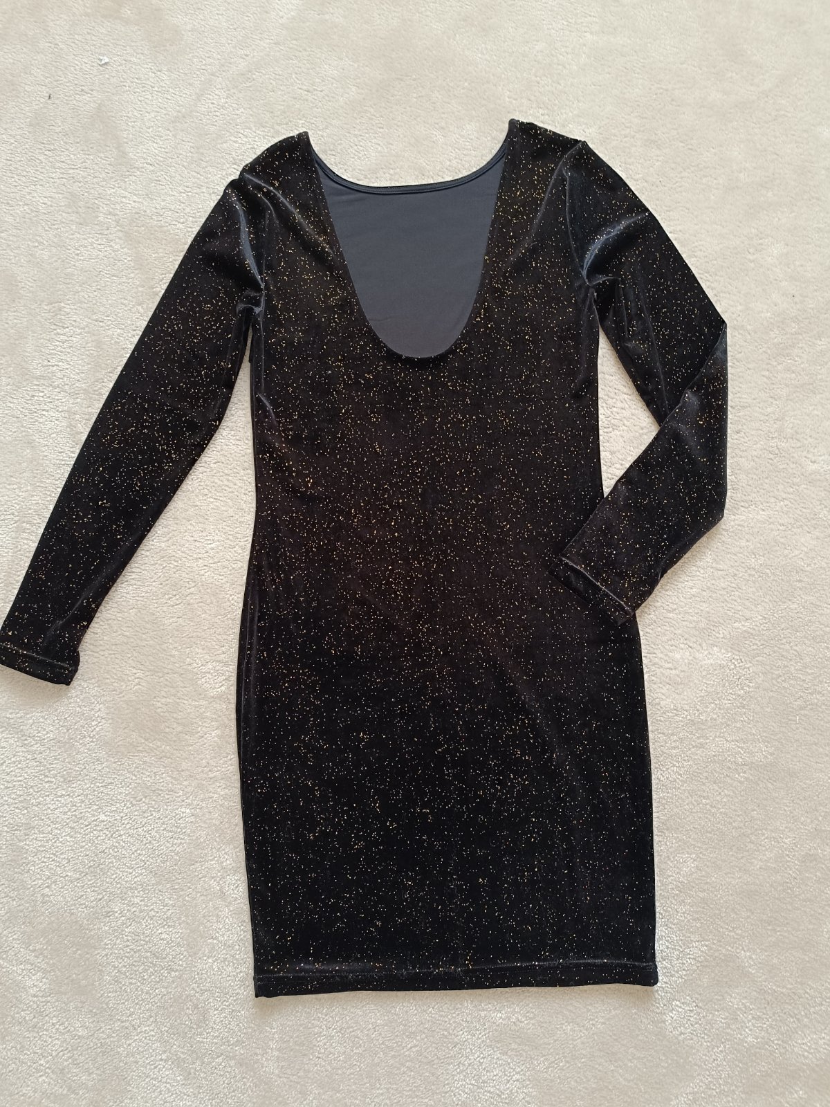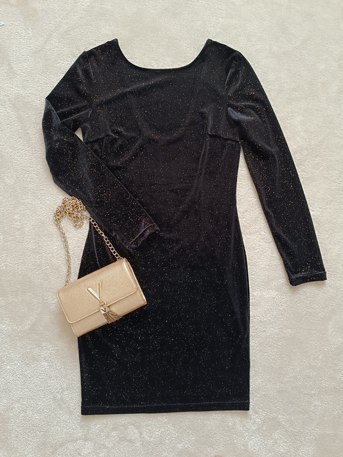 Krasne zamatove saty so zltaymi trblietkami, vacsi sexy vystrih vzadu, dlzka cca 92 cm, latka je elasticka. Uvedena velskot 40 ale skor sedia 36/38,
