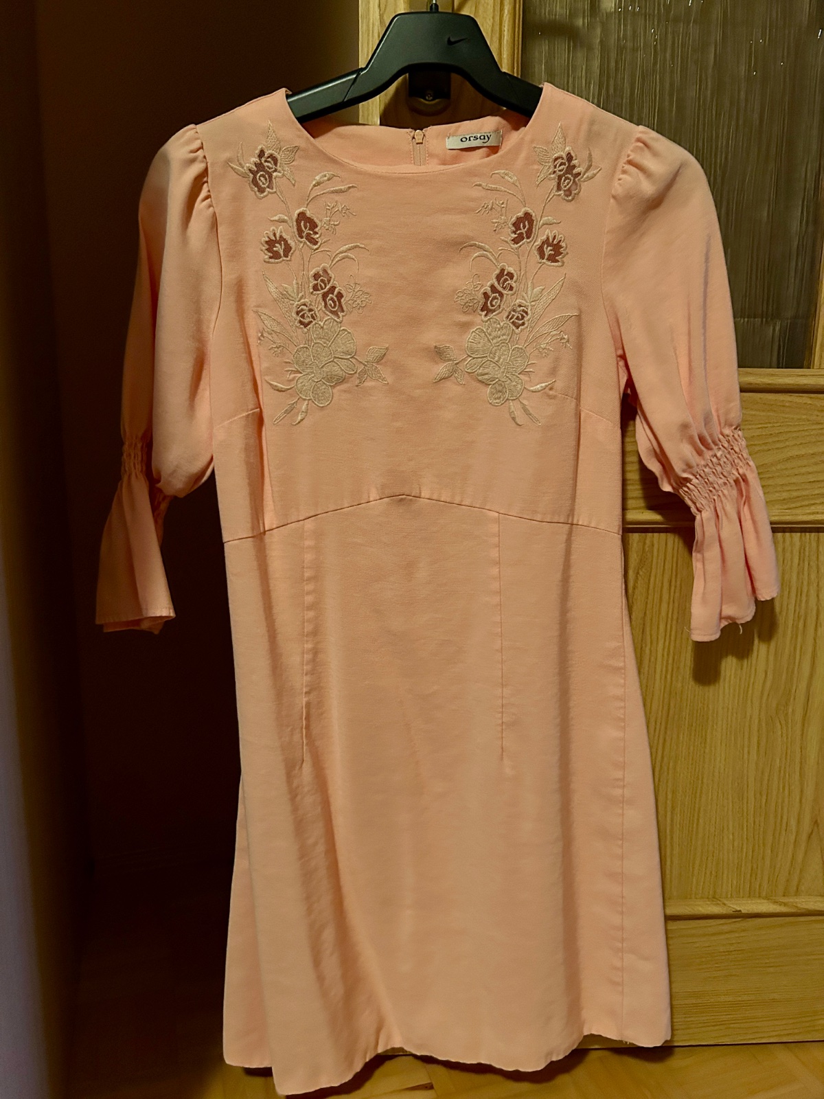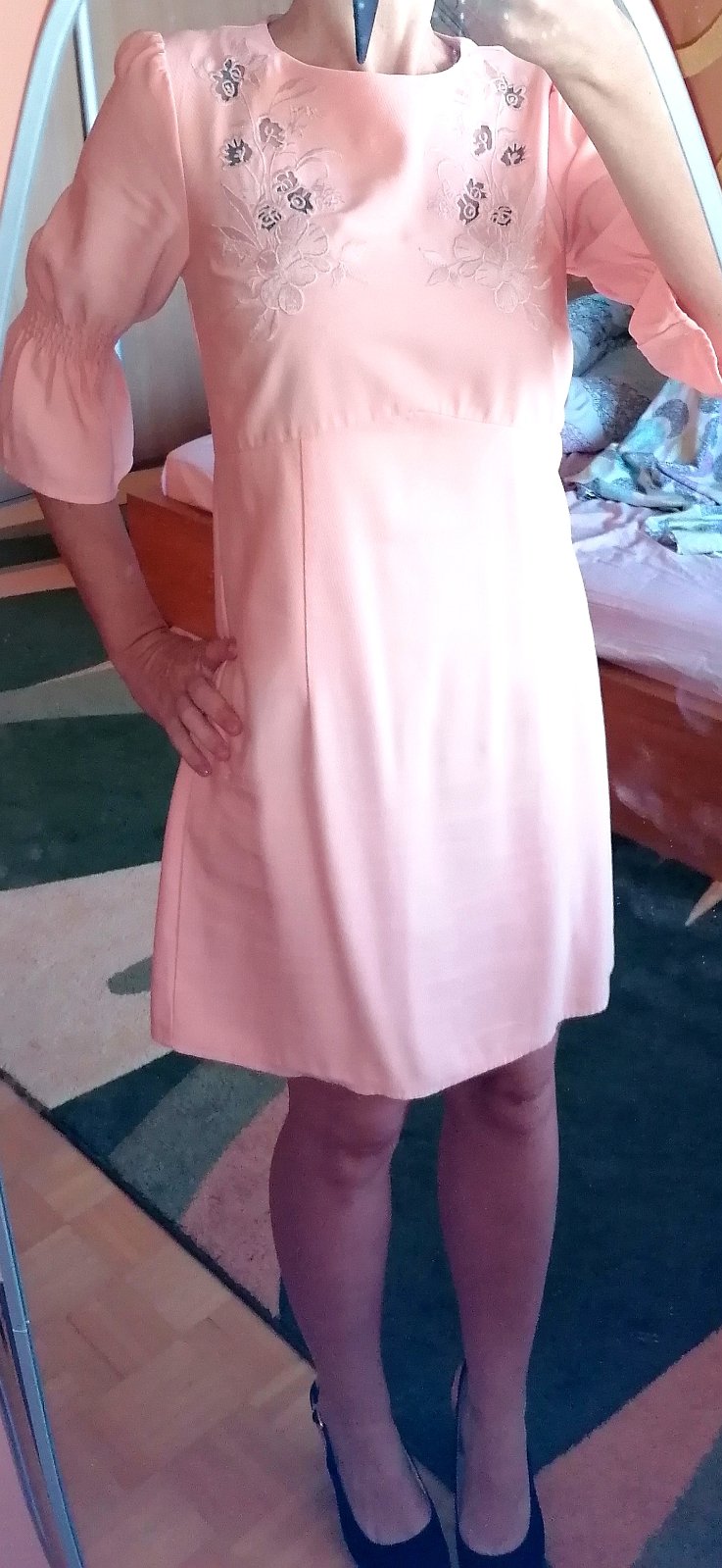 Štýlové šaty sú ušité z pevnej tkaniny. Sú jednofarebné, na hrudi s výšivkou kvetov. Majú okrúhly výstrih. Rukávy sú 3/4 dĺžky, v lakťoch prešité gumičkou a pokračujú rozšírením. Na ramenách sú mierne nariasené. Nad pásom sú prešité, sukňa je Á-čkového strihu. Na chrbte sa zapínajú na zips