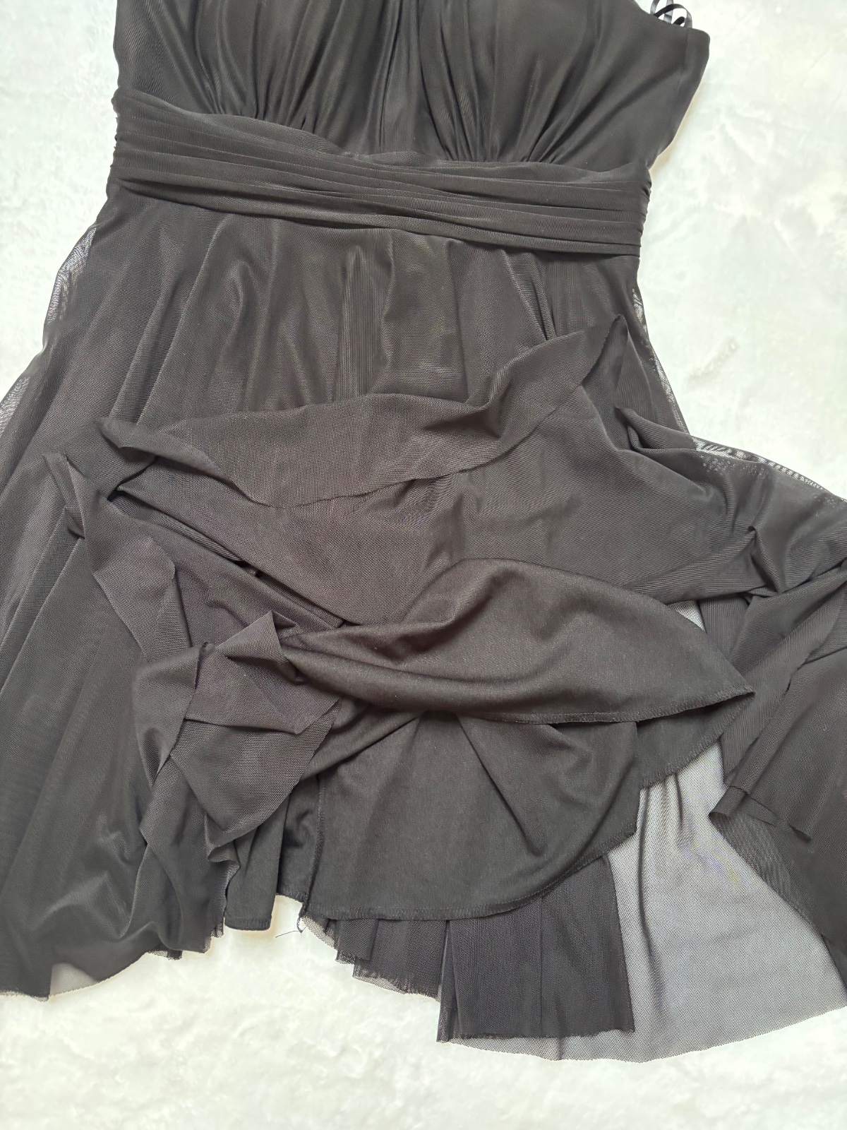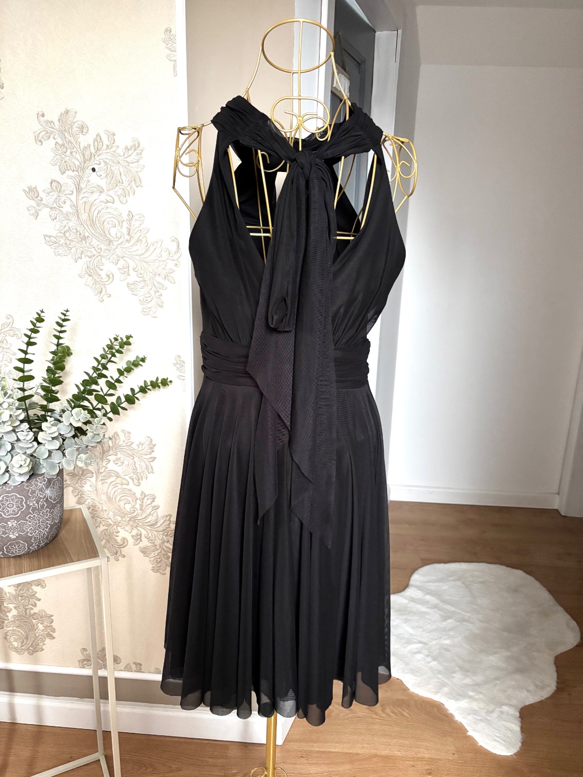 Kvalitné čierne spoločenské šaty, zapínanie vzadu na zips, podšité, nariasené, uväzovanie okolo krku na mašľu, padavý materiál super stav.