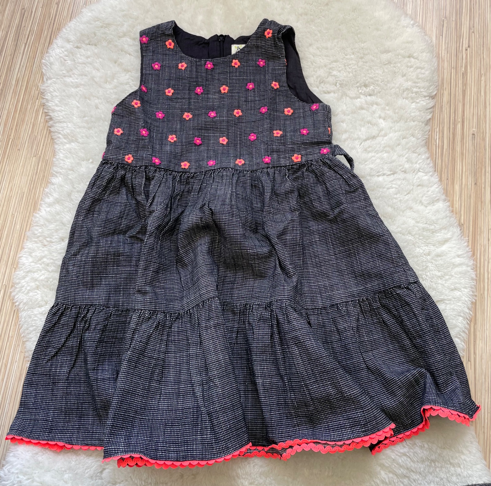 Saty bez rukavov s bohatou suknou z 2 volanov, s vysivanymi ruzickami, cierny podklad s mini hviezdickami. Vzadu na zips, viazanie na maslicku, bezchybne