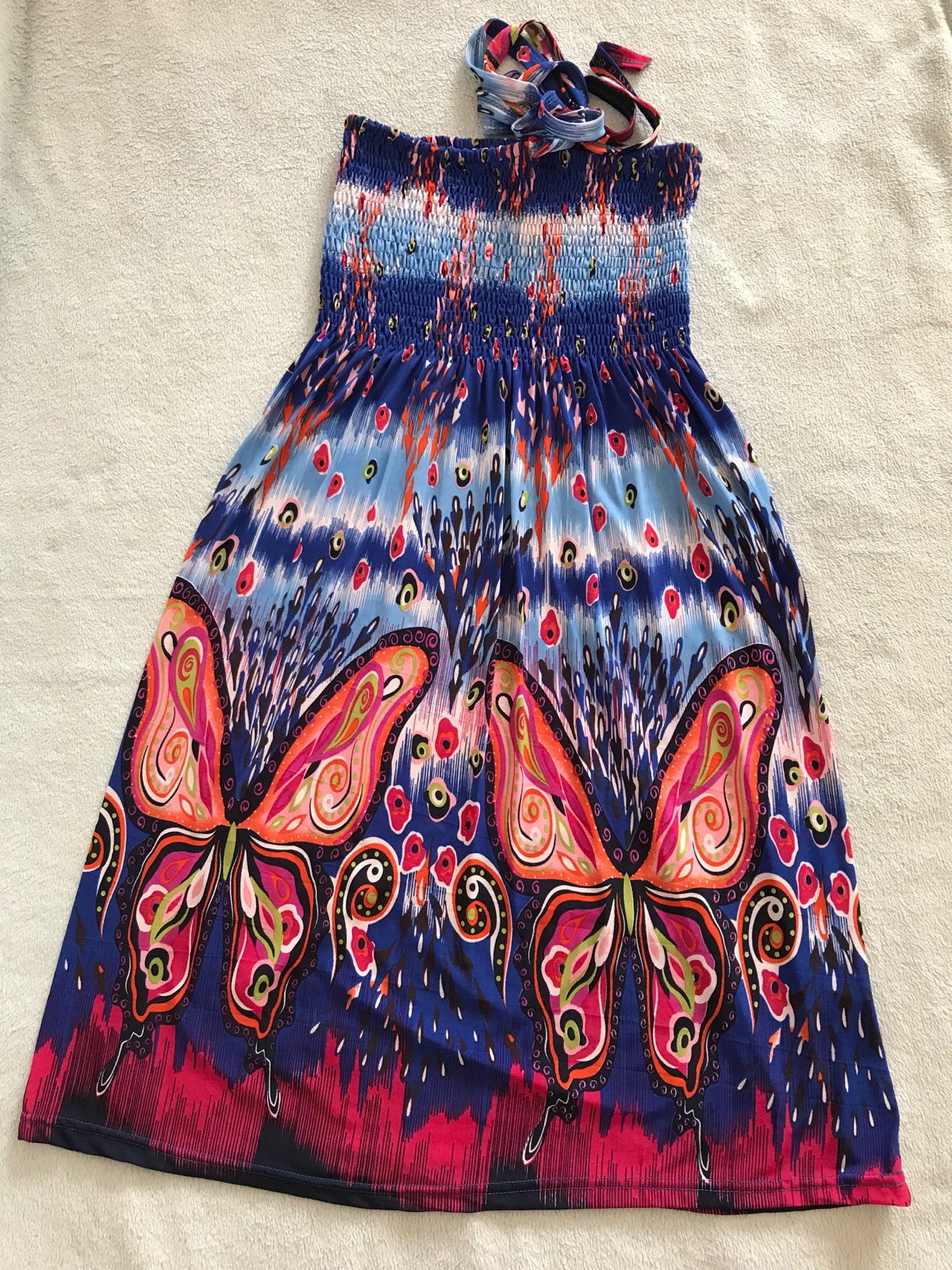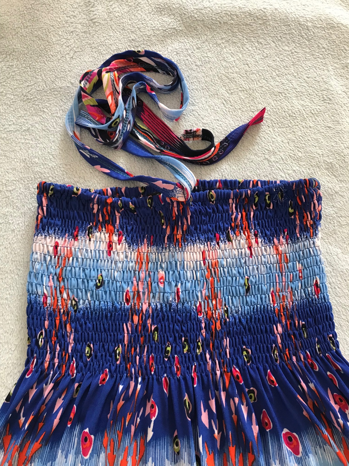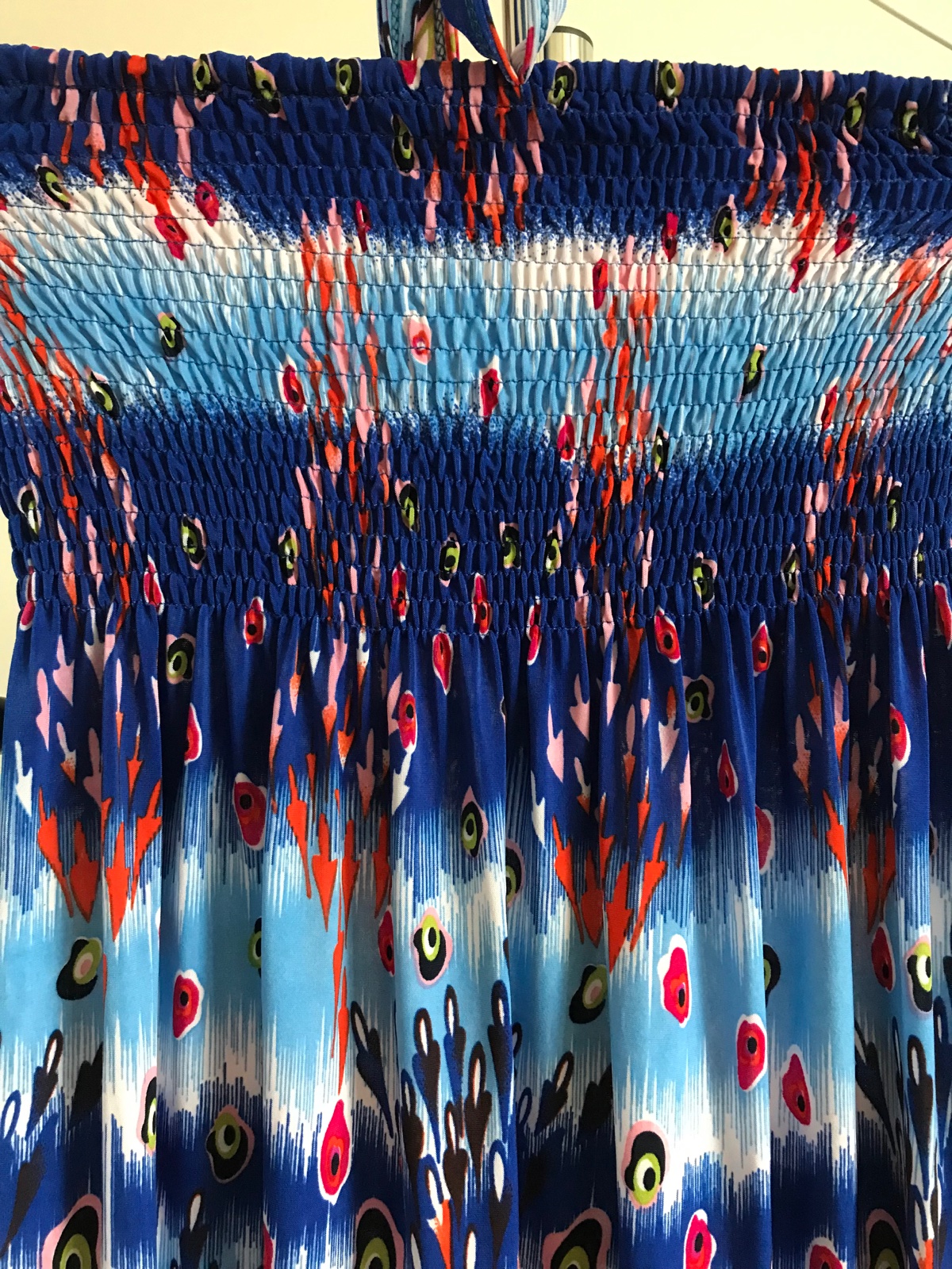 Letné šaty s možnosťou uviazania okolo krku. Vzdušná ľahká látka, krásne sýte farby. Tiež možné využiť aj ako sukňu.