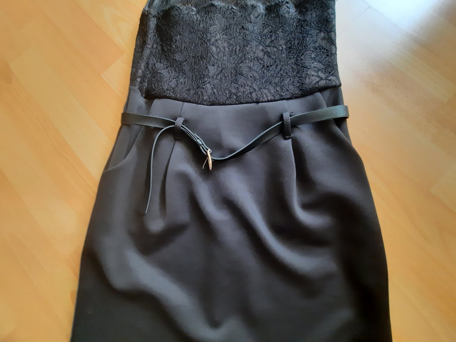 Predám veľmi pekné dámske čierne šaty s opaskom. V páse sú prestrihnuté, vrchná časť je krajka, spodná sukňová časť je z trošku hrubšieho materiálu- veľmi pekne drží tvar. Na ľavom boku je zapínanie na zips. Vpredu na bokoch sú vačky.