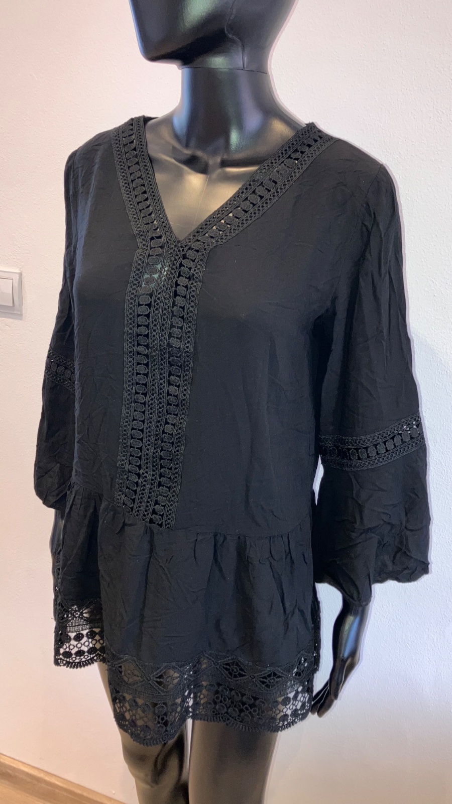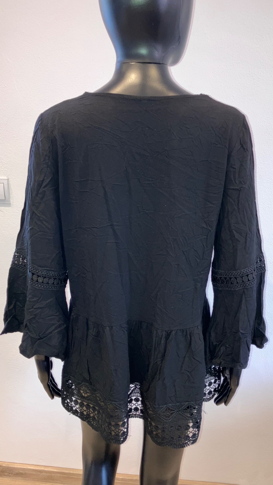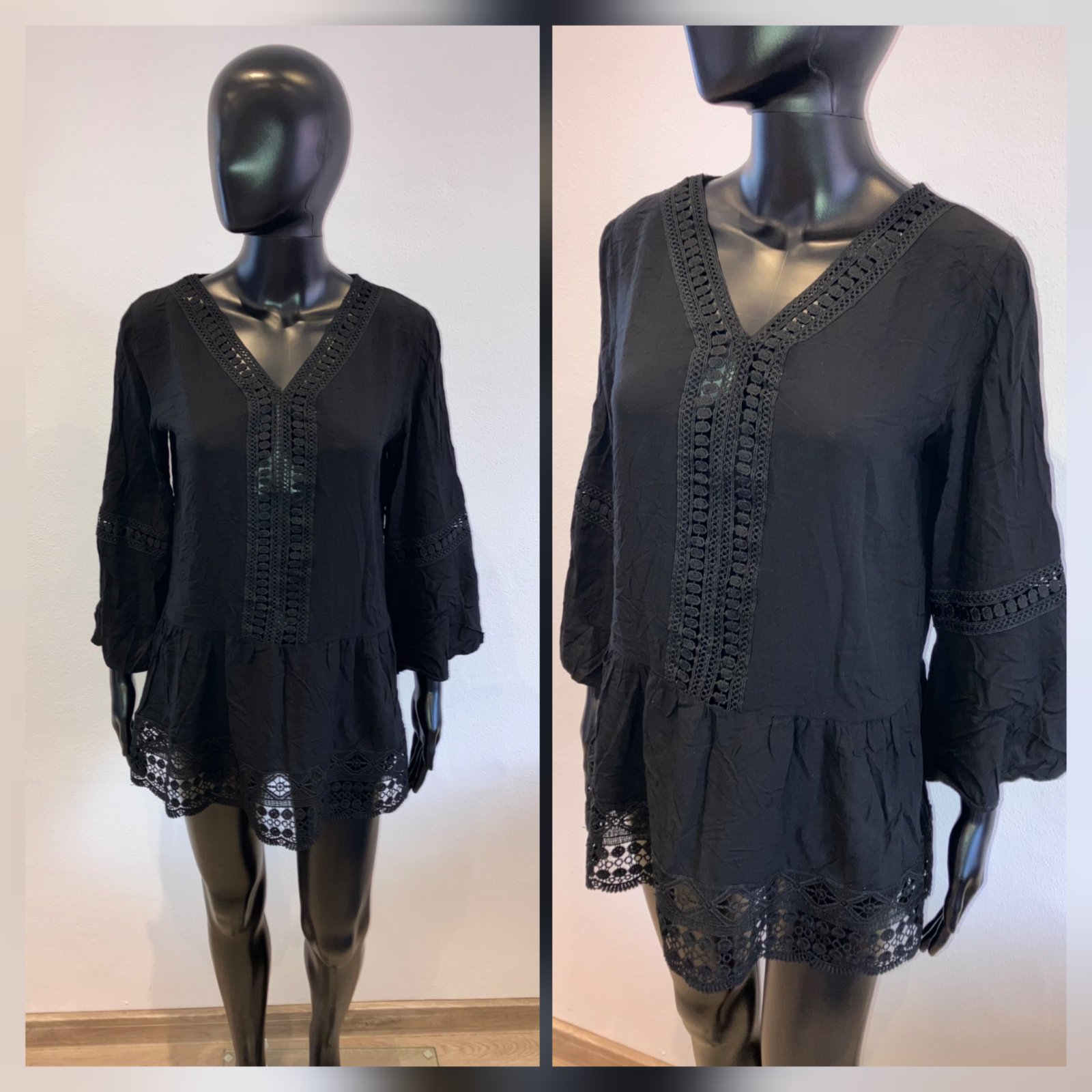 Dámske košeľové šaty zdobené luxusným čipkovaným lemom, zníženým pásom, výstrihom do V a rozšírenými rukávmi, tenké, nie sú elastické. Vhodná je aj ako tunika.