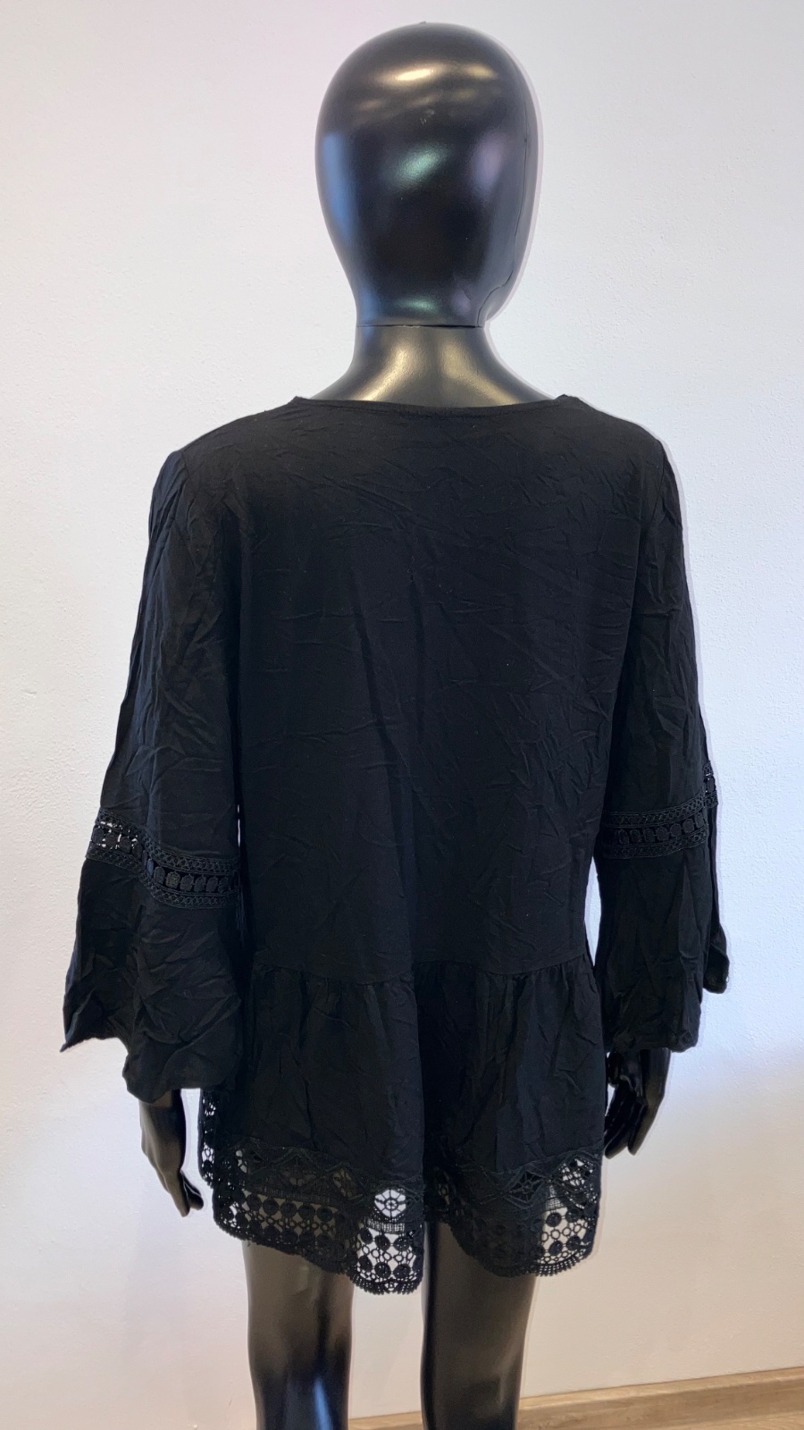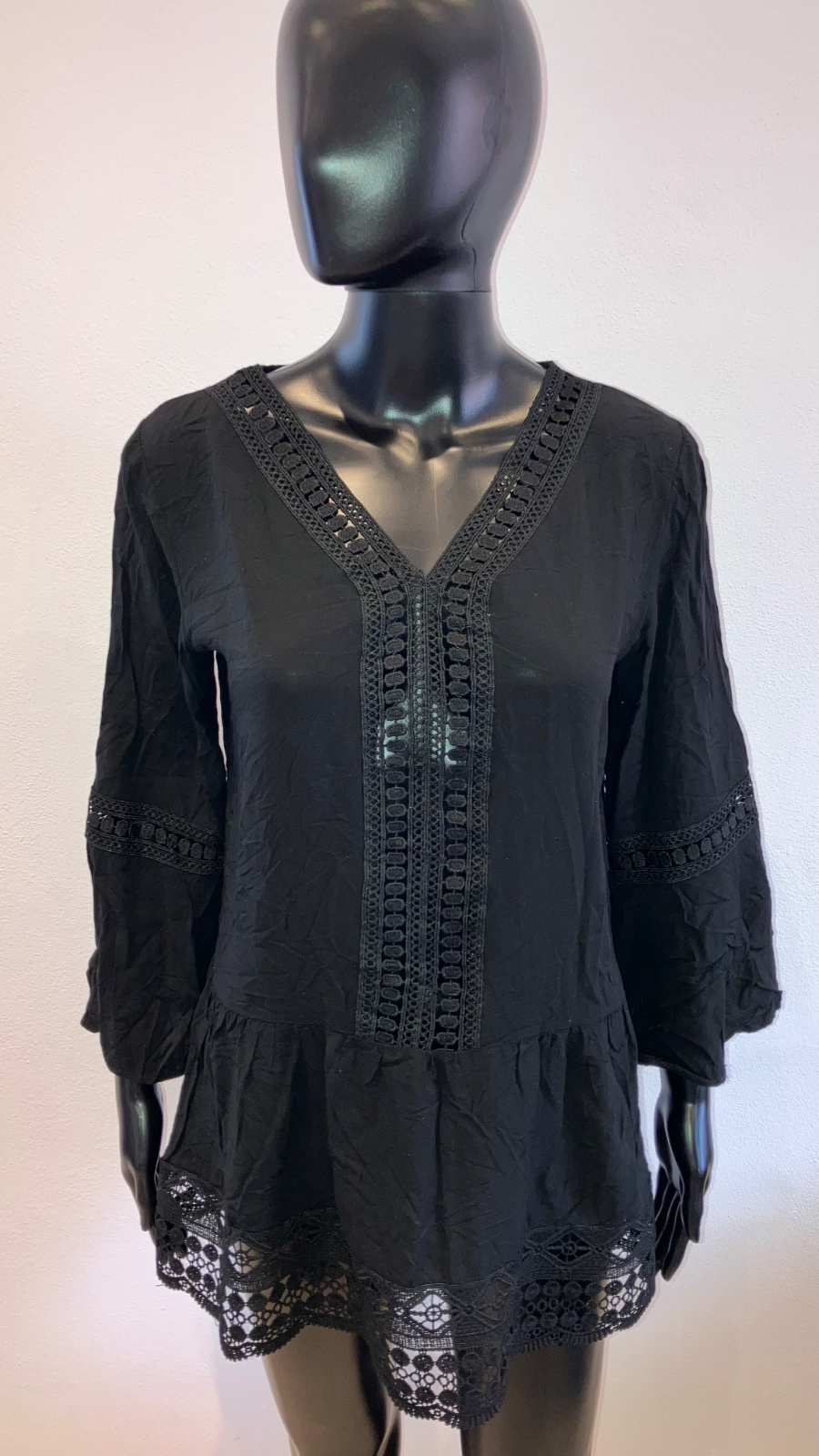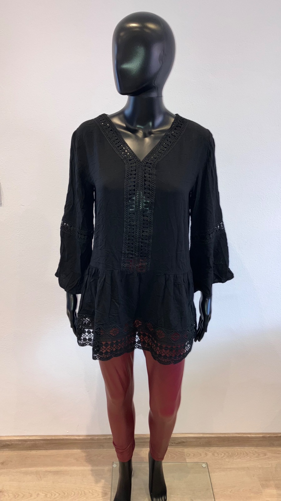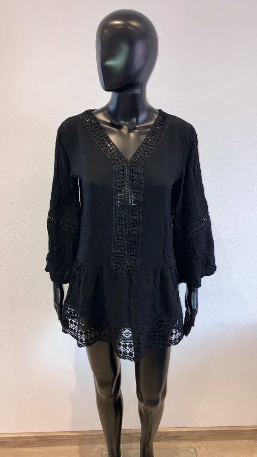 Dámske košeľové šaty zdobené luxusným čipkovaným lemom, zníženým pásom, výstrihom do V a rozšírenými rukávmi, tenké, nie sú elastické. Vhodná je aj ako tunika.