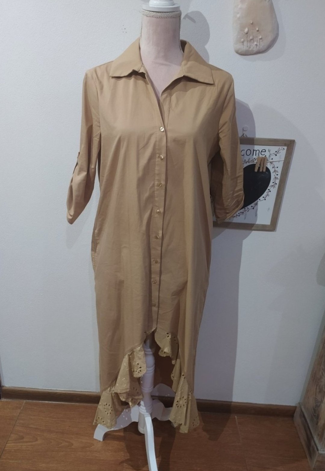 Krásne ,košeľové šaty v top stave,predný diel kratší ,zdobené azurovou krajkou,bočné vrecká.Moznost nosiť voľné alebo s opaskom.predaj bez opasku,veľ Uni vhodné pre veľ S-M