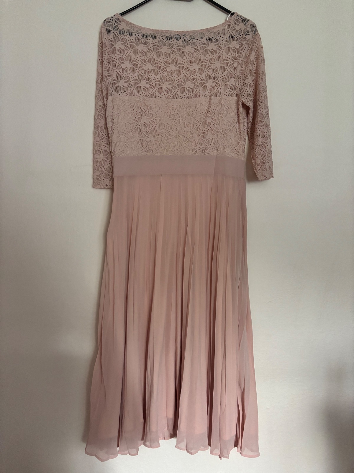 Nadherne saty,bledoruzovy spodok a vrch tylovy trblietavy ,elasticke,dlzka 111 a sirka cez prsia až do 106cm
