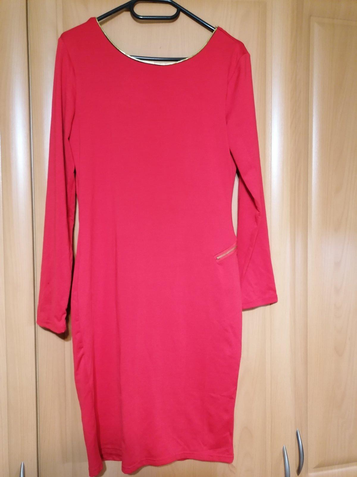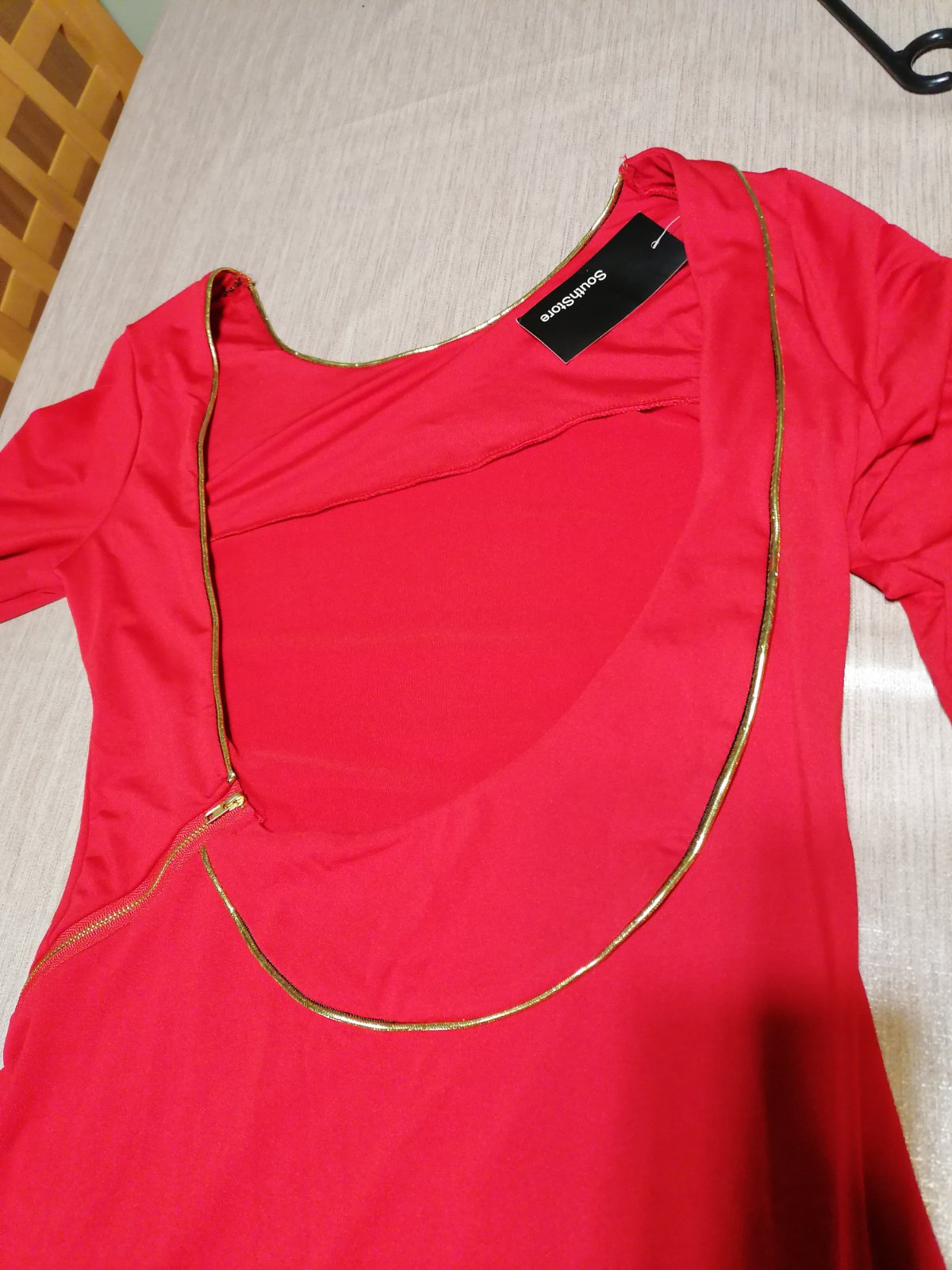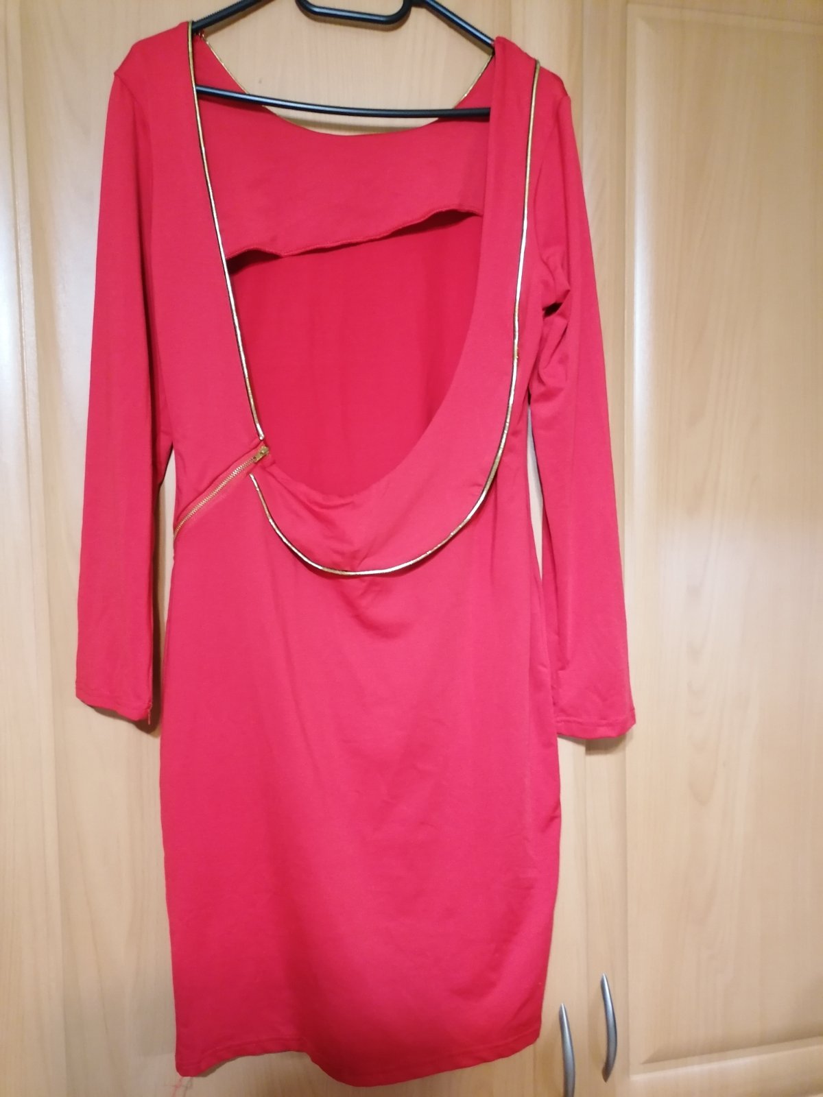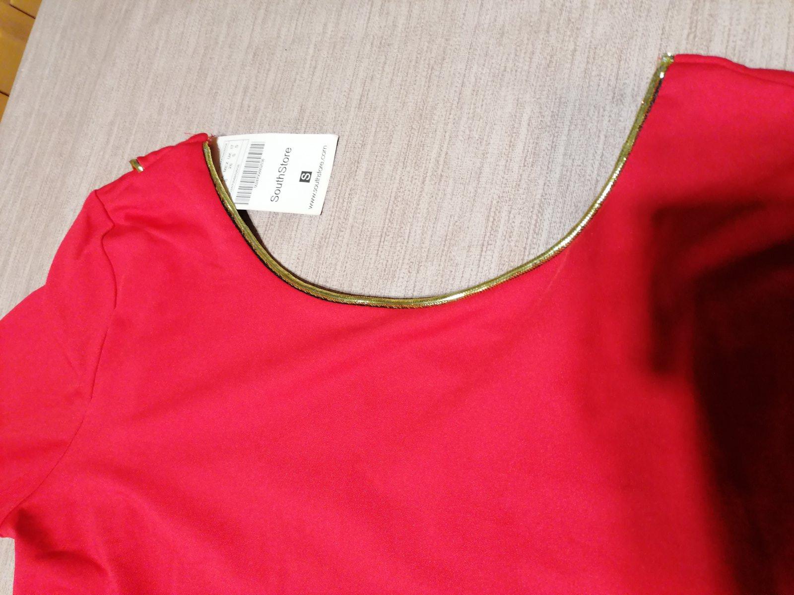 Jedinečné exkluzívne šaty, aké nebude mať nikto. Kupované v zahraničí a ani raz neboli oblečené,suj s visačkou. Zn. Southstore, veľkosť S. Sú žiarivej červenej farby, vpredu decentné, s jemným zlatým lemom, ktorý šaty dotvára hlavne vzadu. Chrbát odhalený. Látka príjemná, elastická, nekrčivá. Celková dĺžka od ramena dole 93 cm, v prsiach v kľude 2x44cm, povolia koľko treba. Pás v kľude 2x38cm, prispôsobí sa. Jedinou chybou šiat je to, že na konci rukáva sú akoby od fixky (pozri detailnú fotku), ťažko povedať, či to pôjde dole, resp.ako to bude vidieť po opratí. Možno skrátiť rukáv na 3/4ťovy, alebo na krátky. Táto chyba zohľadnená v cene, pri kúpe si to ich kupujúca nevšimla.