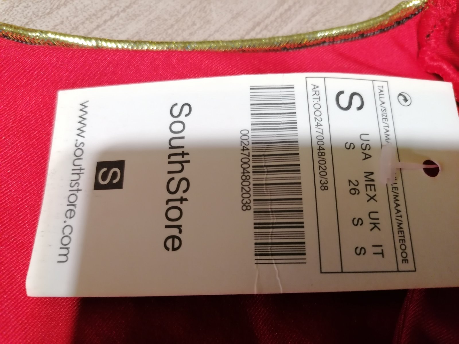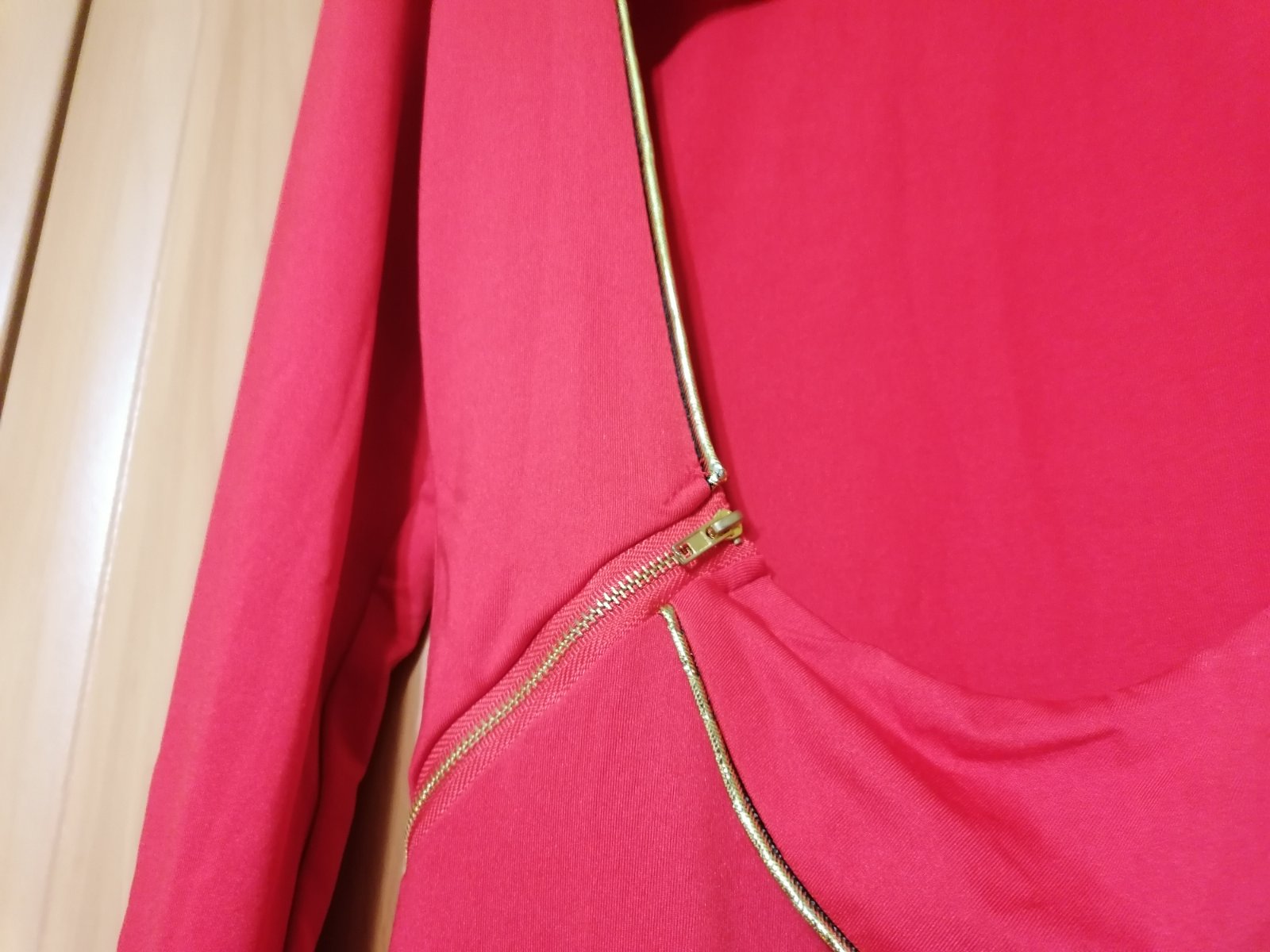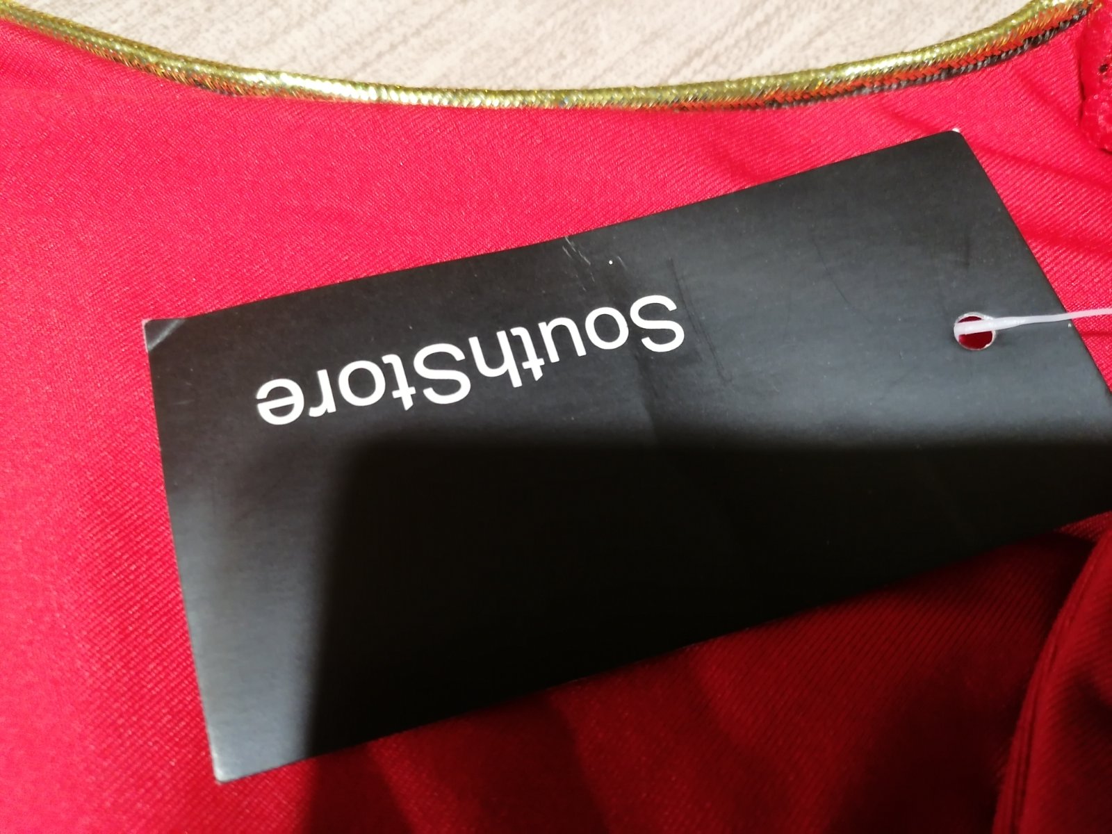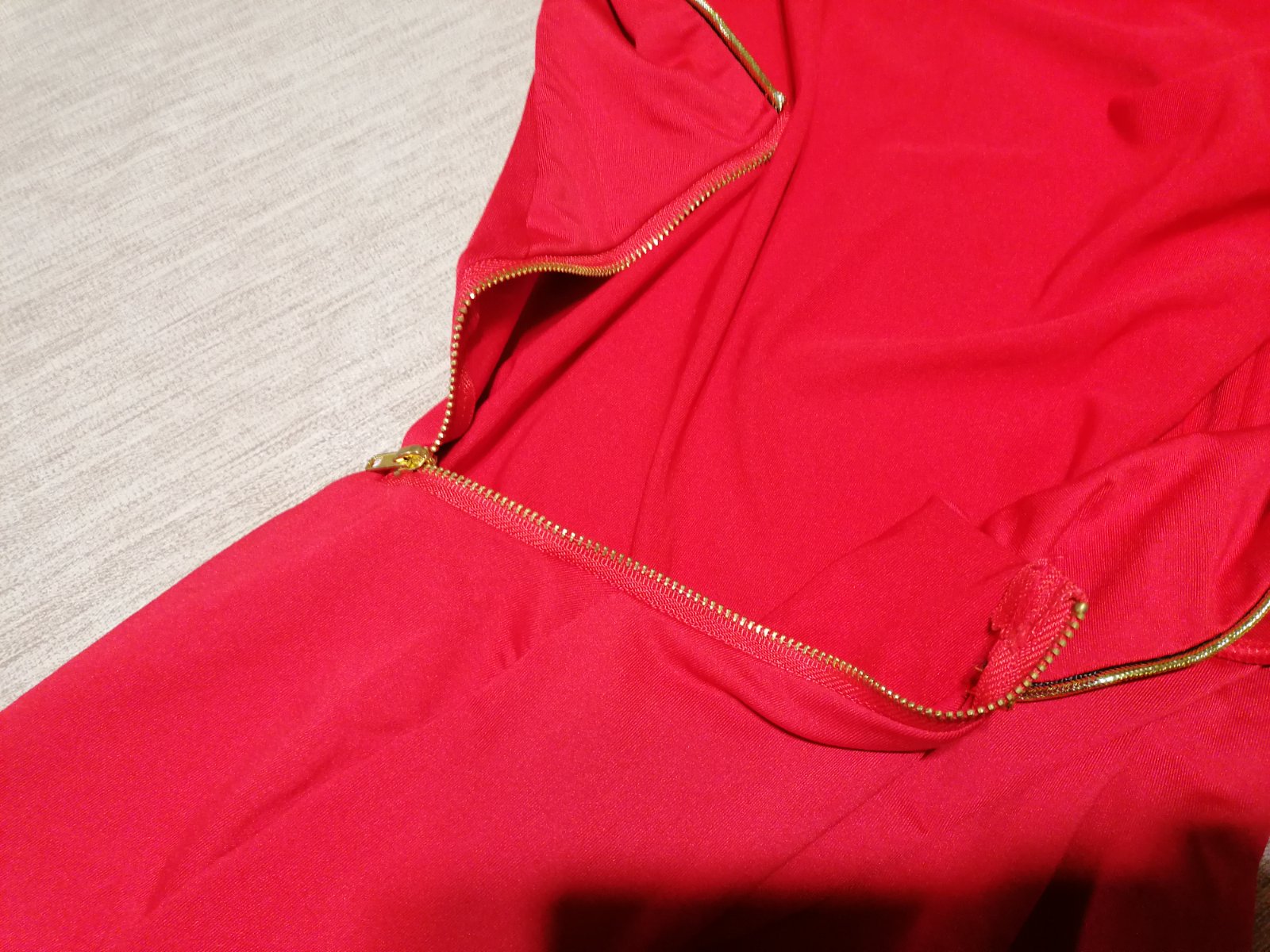 Jedinečné exkluzívne šaty, aké nebude mať nikto. Kupované v zahraničí a ani raz neboli oblečené,suj s visačkou. Zn. Southstore, veľkosť S. Sú žiarivej červenej farby, vpredu decentné, s jemným zlatým lemom, ktorý šaty dotvára hlavne vzadu. Chrbát odhalený. Látka príjemná, elastická, nekrčivá. Celková dĺžka od ramena dole 93 cm, v prsiach v kľude 2x44cm, povolia koľko treba. Pás v kľude 2x38cm, prispôsobí sa. Jedinou chybou šiat je to, že na konci rukáva sú akoby od fixky (pozri detailnú fotku), ťažko povedať, či to pôjde dole, resp.ako to bude vidieť po opratí. Možno skrátiť rukáv na 3/4ťovy, alebo na krátky. Táto chyba zohľadnená v cene, pri kúpe si to ich kupujúca nevšimla.