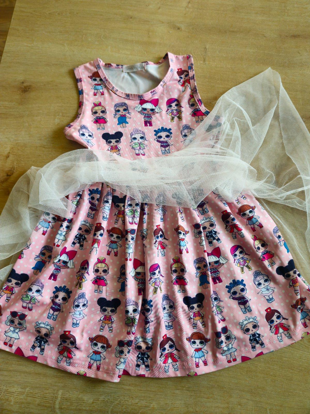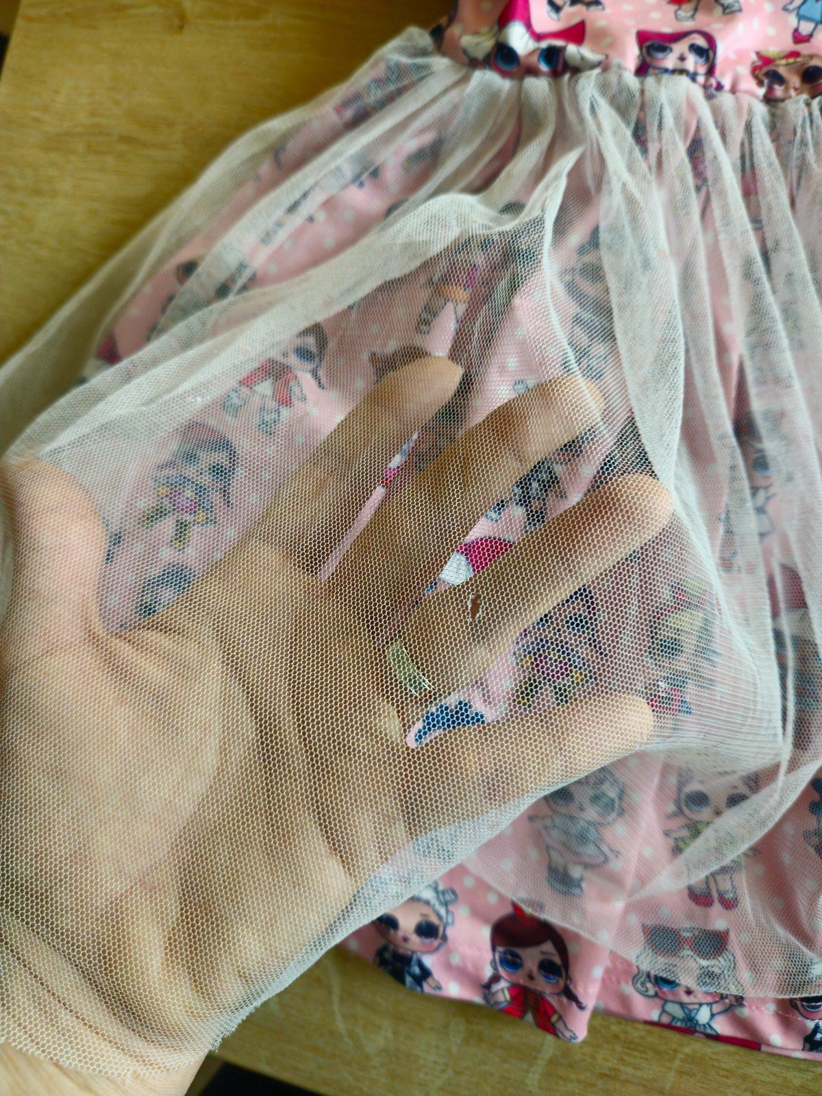 Velkost 120. Zodpoveda tak 116-122. Tylova cast uz ma na viacerych miestach dierky a aj zo spodu je mierne rozstrapkana. Pri noseni to az tak nevydno, kedze je to skladany tyl. Kazsopadne zohladnujem to v cene. Po opraveni tylu, pripadne odparani, spodna vrstva je stale pekne ziariva a bez poskodeni