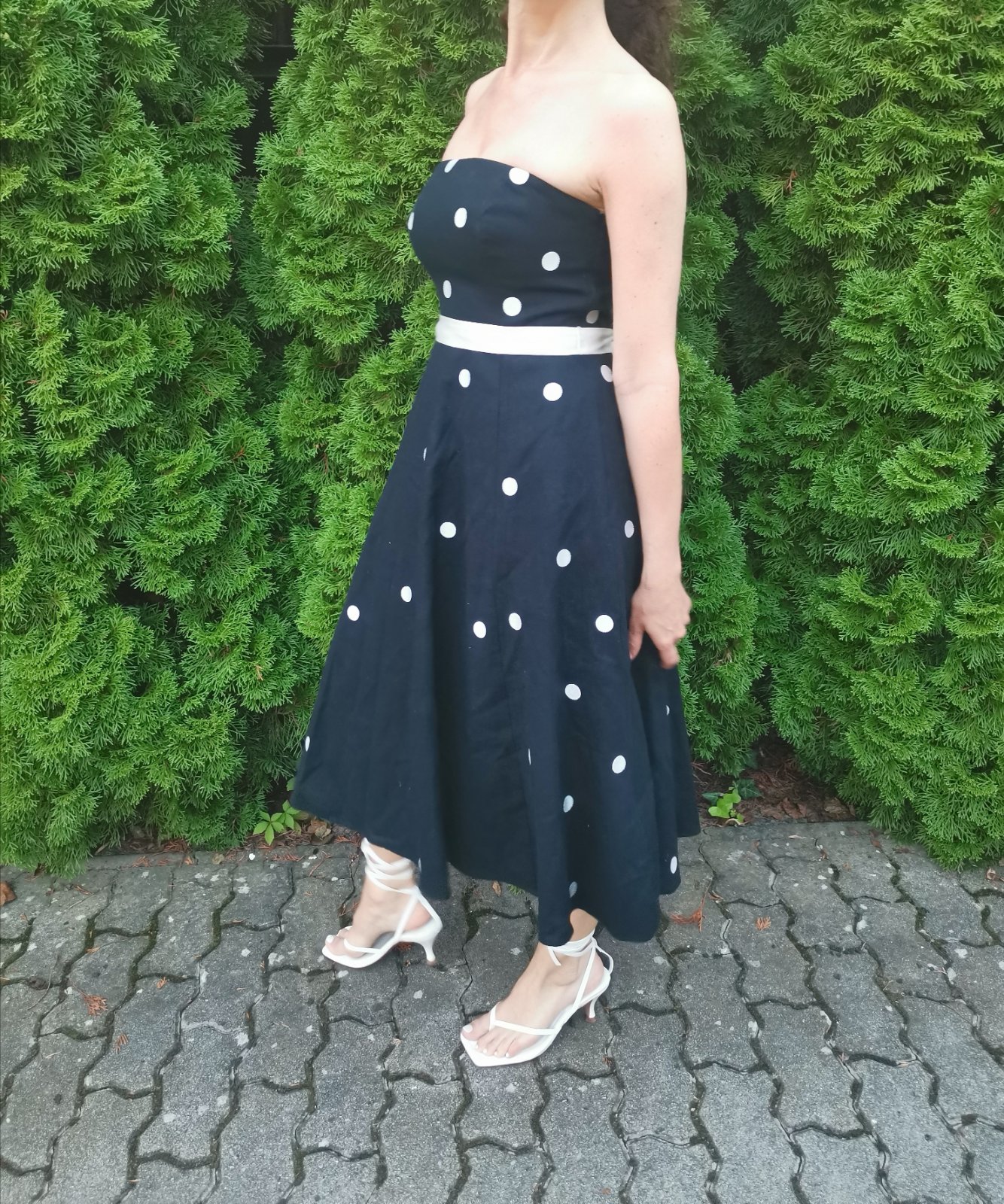 Čierne korzetové šaty s bielými bodkami a s bielym hodvábnym opaskom známej britskej značky Coast. Zapínanie je zipsom na ľavej strane. Šaty majú tylovú a saténovú spodničku. Málo nosené, v dobrom stave.