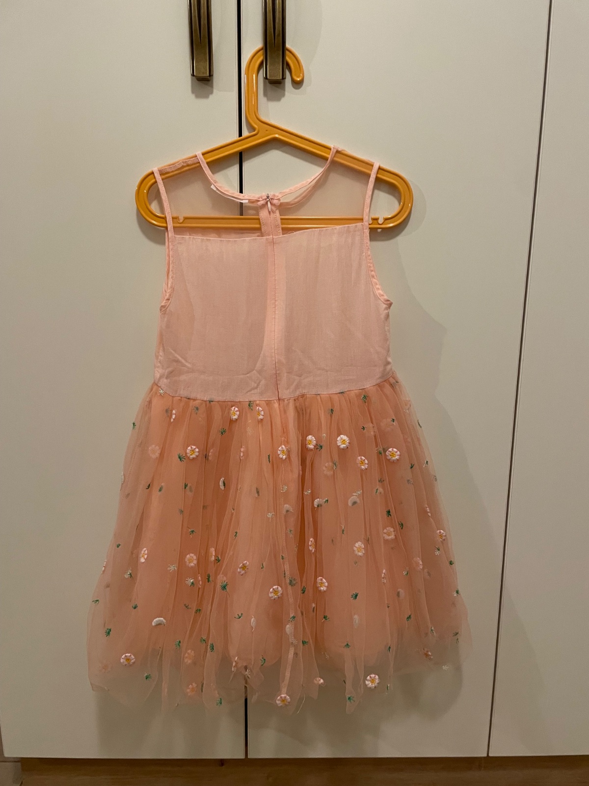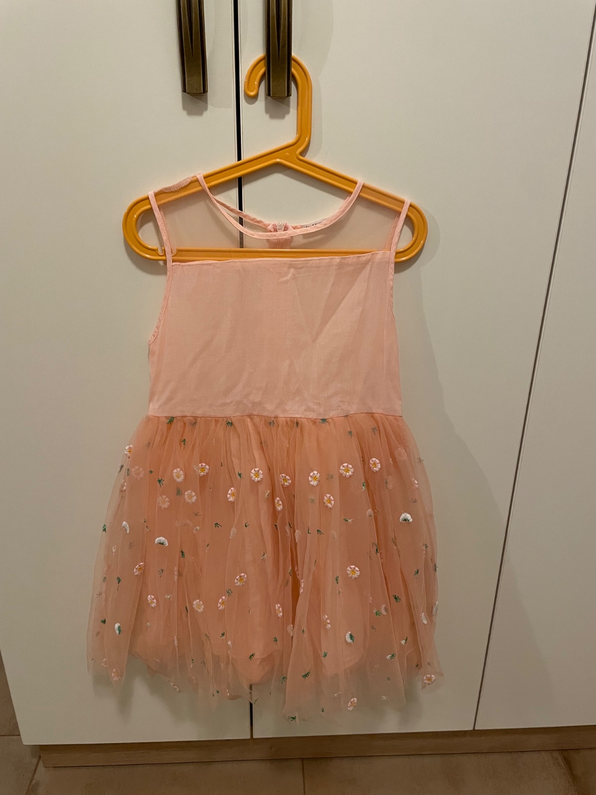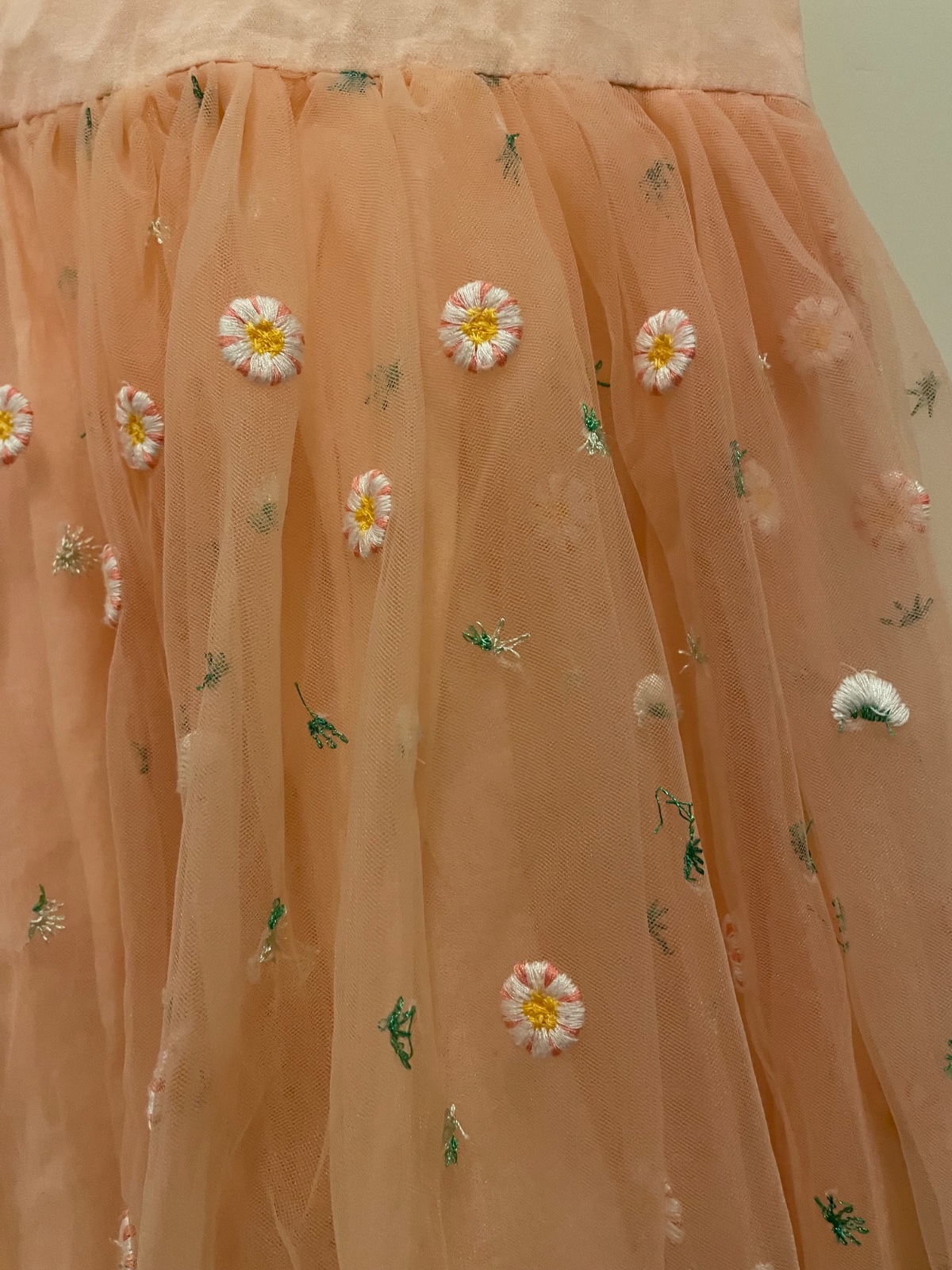 Predam mile tenke ketne saty s tylovou suknou s vysivami sedmikraskami. Pisu vel. 134, ale podla mna su skor vel. 128. Dlzka cca 67cm, sirka v pase 33cm. Zapinanie vzdadu na zips. Saty su vo velmi dobrom stave, bez poskodeni.