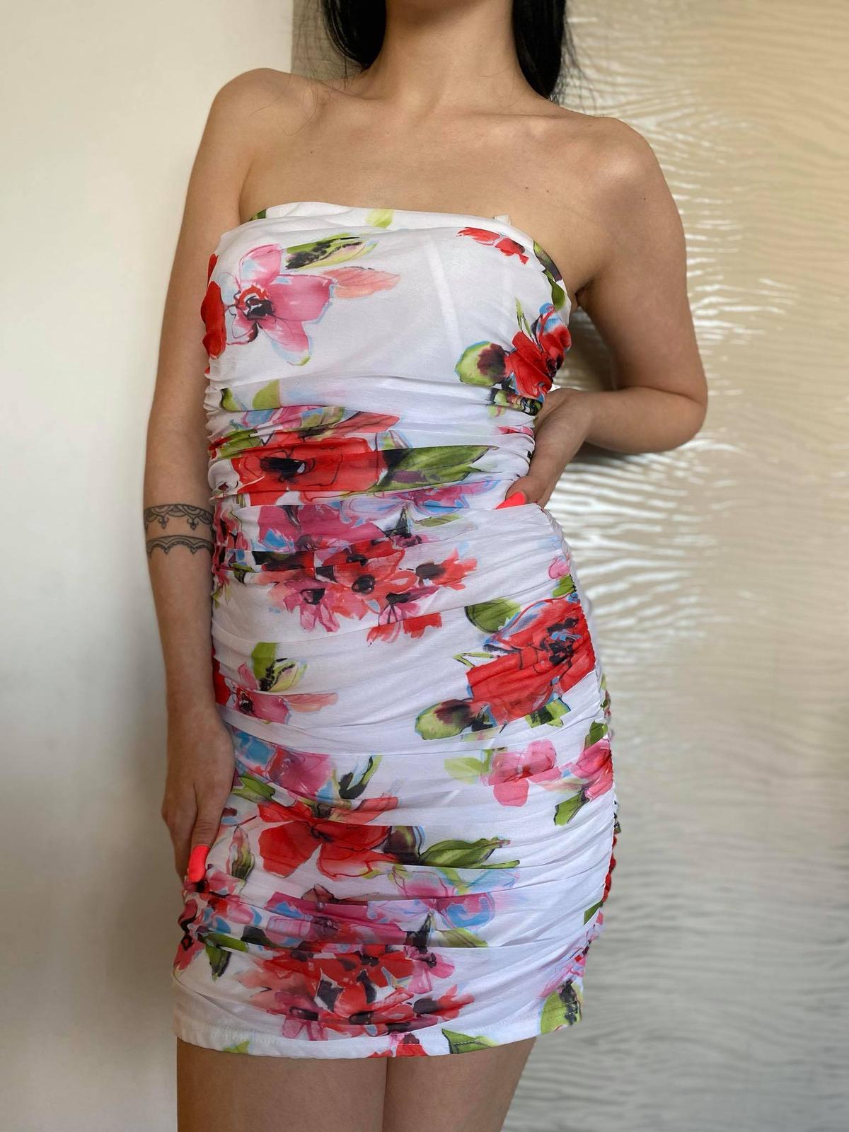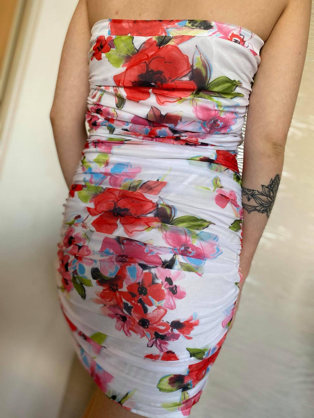 Pekné letné šaty z príjemného materiálu. Sú celé podšité, zboku sú nariasené. Raz oblečené. Dĺžka 70 cm.
