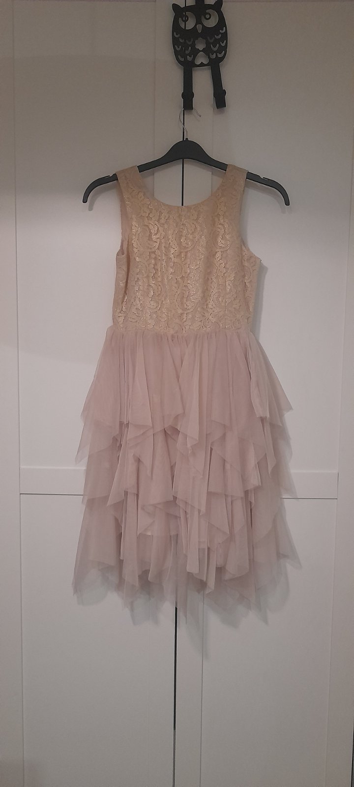 Predám dievčenské spoločenské šaty zn.H&M, vel.140. TOP stav, len 1x oblečené. Zapínanie na chrbte, tylové šaty podsite spodnickou, zdobene flitrami. Rozmery: celková dĺžka 87cm, pás: 2x37cm.