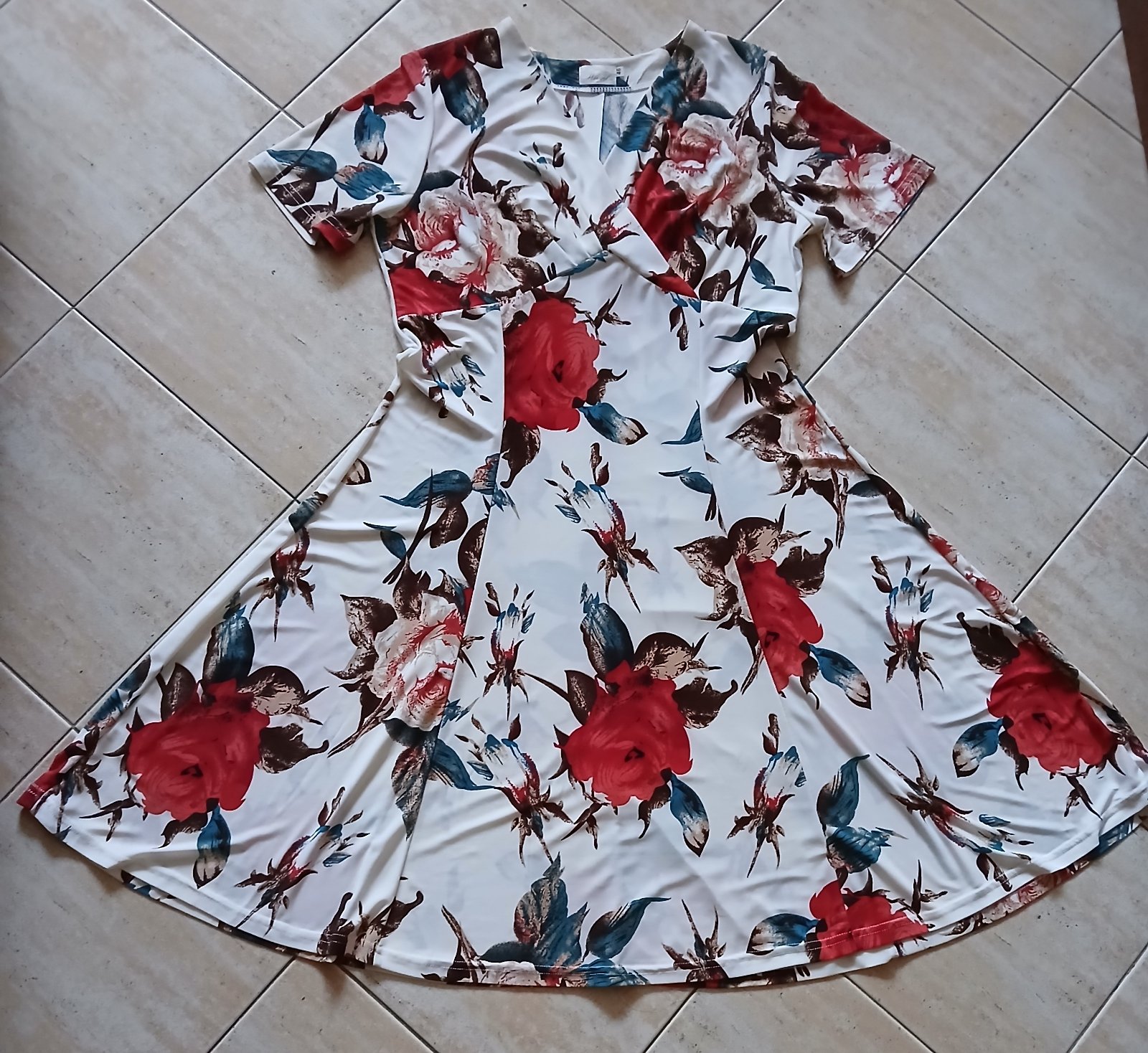 Predám dámske šaty málo nosené, a vo výbornom stave. Veľkosť č.46, zloženie: 90% viskóza a 5% elastan. Celková dĺžka šiat meraná od ramena po spodok je 97 cm. Šaty majú krátky rukáv a výstrih do V.