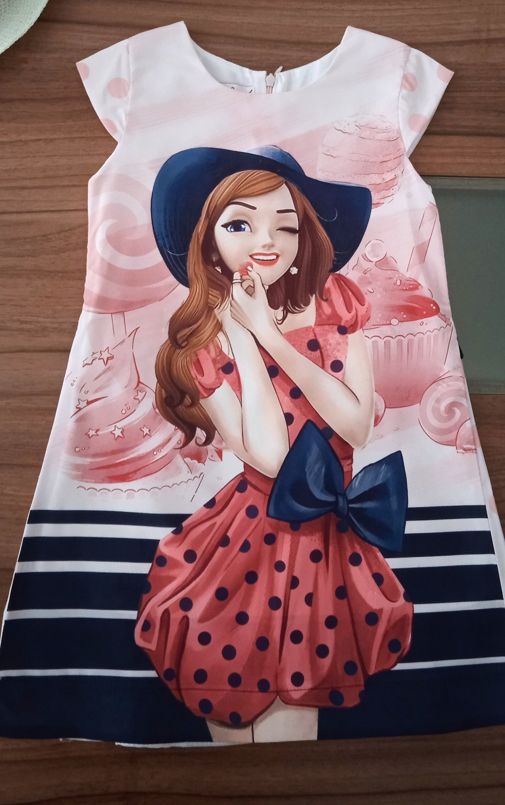 Letné šaty so zaujímavým vzorom. Je možné pripevniť zatváracím spendlikom závoj na tvár dievčaťa. Dĺžka 62 cm, šírka pod pazuchami 33 cm. K dispozícii je aj klobúk. Bez poškodenia.
