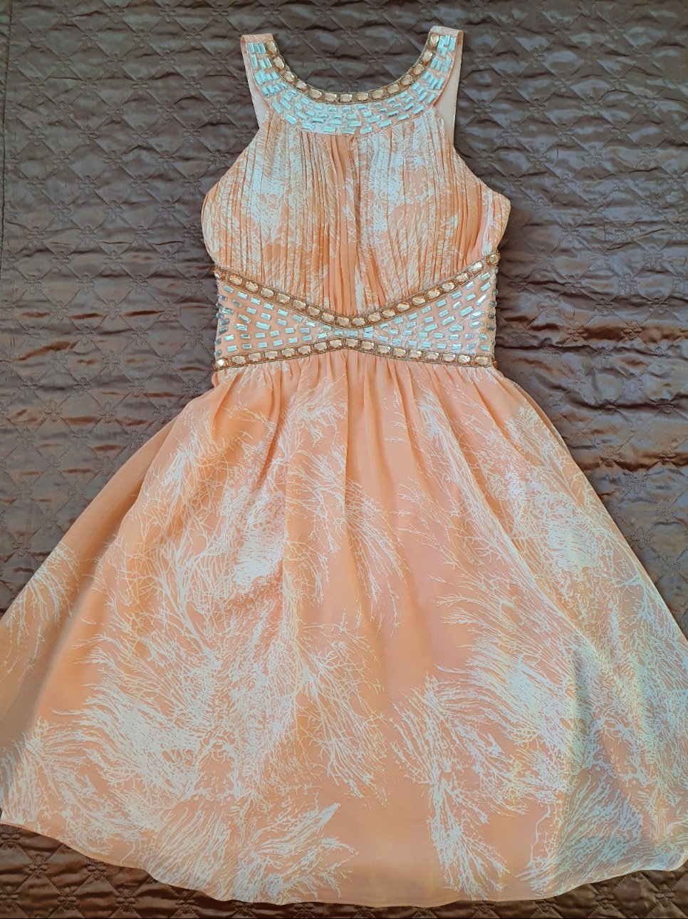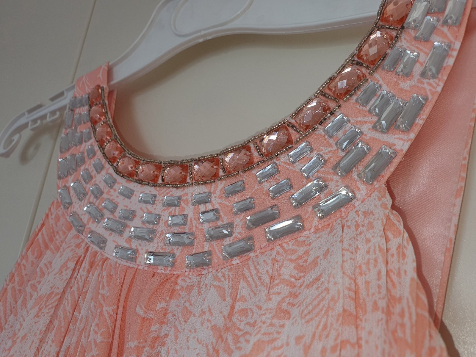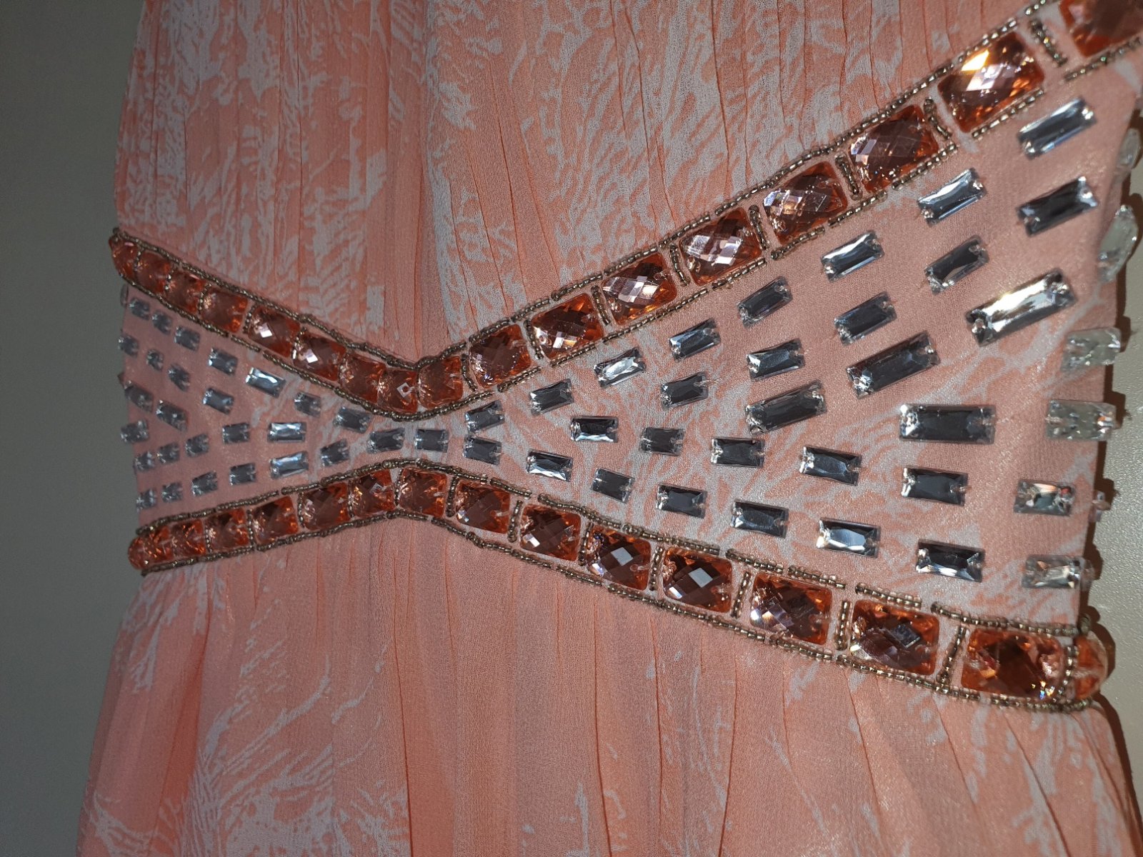 Posúvam na predaj tieto unikátne spoločenské šaty, kupované zo zahraničia, zdobené ručne našitými kamienkami jemne ružovej, resp. lososovej farby so zaujímavým vzorom a skvelým strihom.