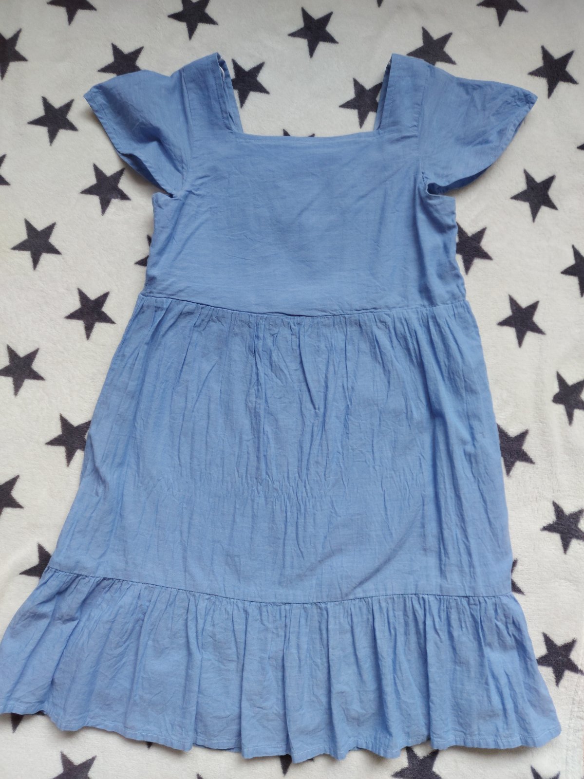 Predám letné šaty bez rukávov, hore s 11 cm volánom na gumku, bledomodrej farby, materiál príjemný (100 % lyocell), imitácia rifloviny. Veľ. 152, zn. H&M. Vpredu stredom dĺžka 69 cm, vzadu 73 cm, š...