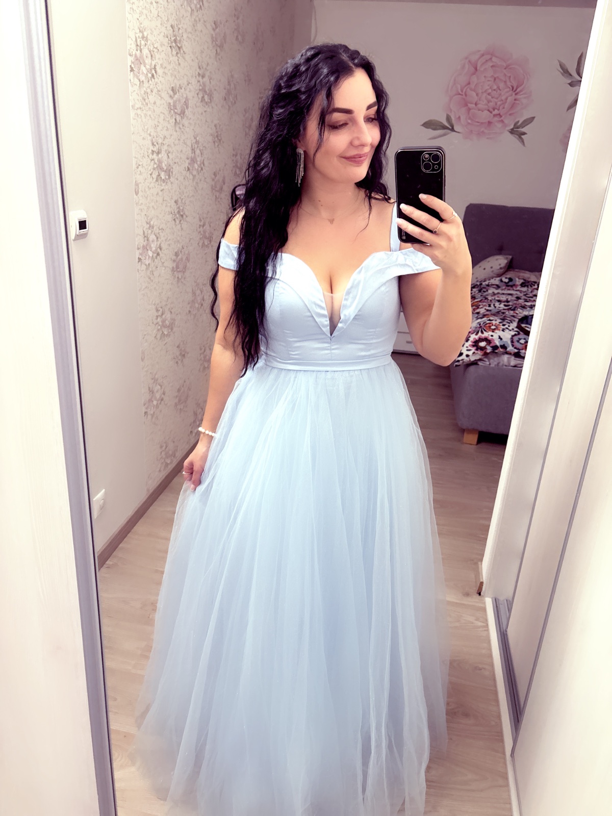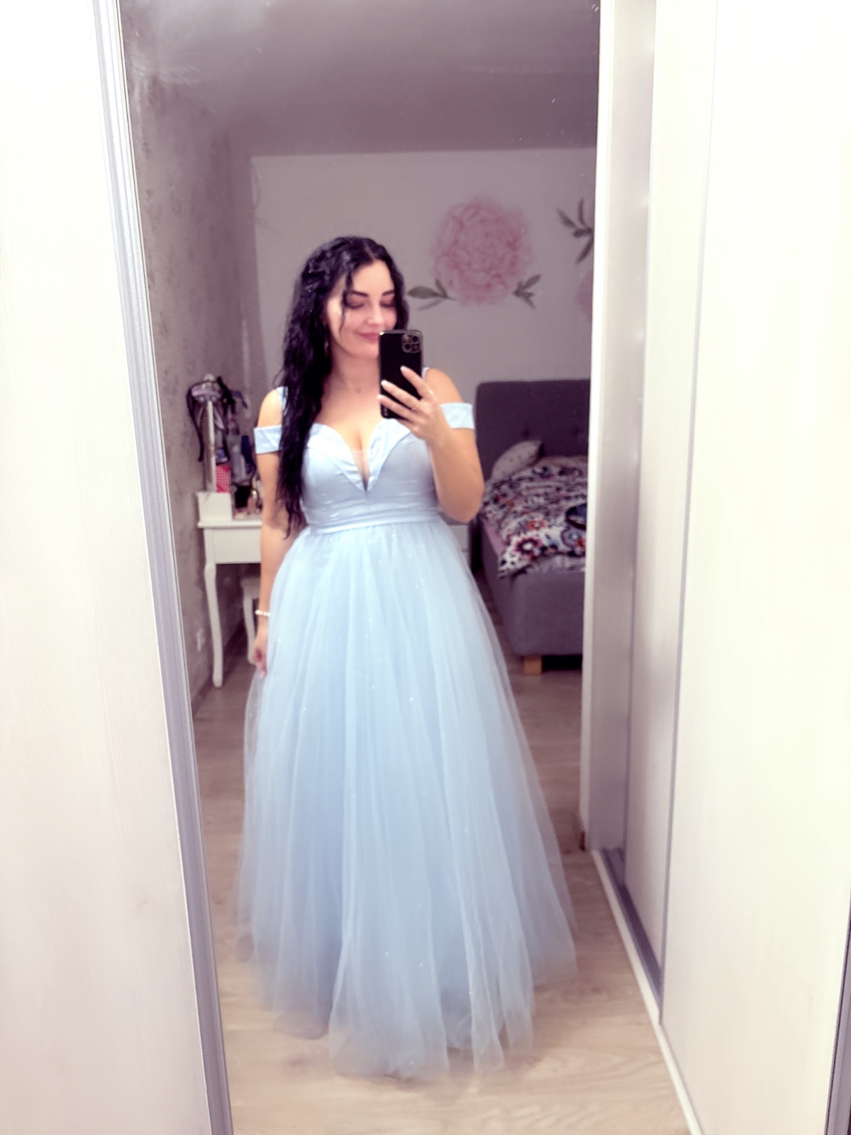Predám raz použité plesove šaty bledomodrej farby vhodne na veľkosť 30-40