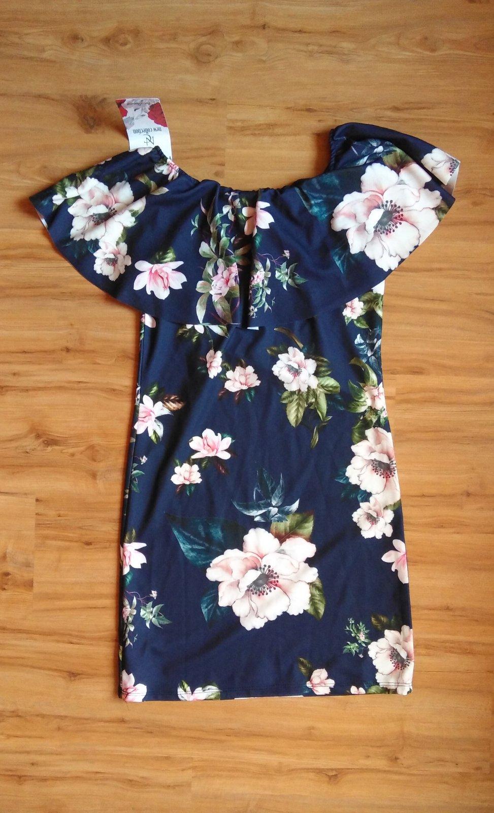 Nádherné letné šaty v tmavomodrej farbe plné kvetov, s volánom cez plecia, krásne zvýraznia postavu. Veľkosť UNI, sedí na XS, S, M, dĺžka od zaciatku volánu 76cm, prsia 2x42 až 2x47cm, pás 2x37 až 2x42cm, boky 2x43 až 2x51cm.