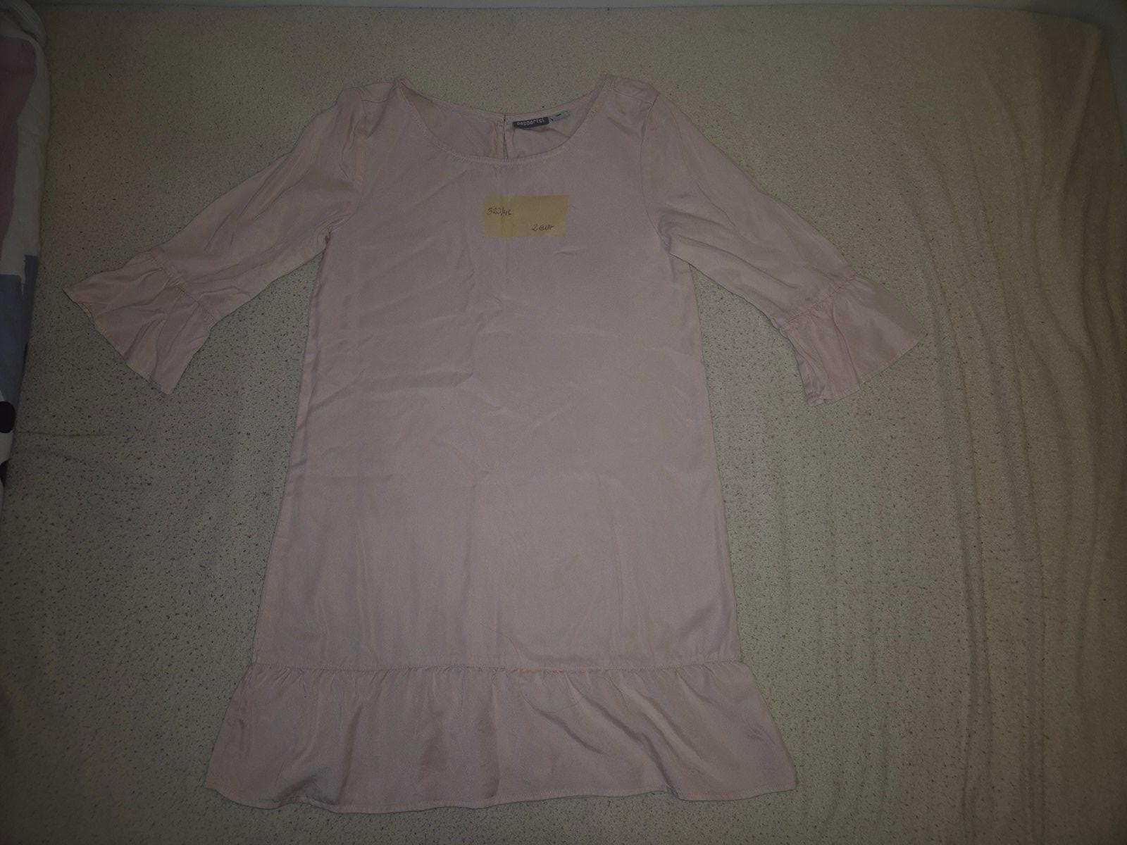 Šaty zn. Name it veľ. 146, 100% polyester, okrem rukávov podšité, farba jemná pudrovo ružová alebo ružovo fialková. Dĺžka: 77 cm Šírka pod pazuškami: 37 cm Rukáv: 39 cm Asi 2x oblečené, bez poškode...