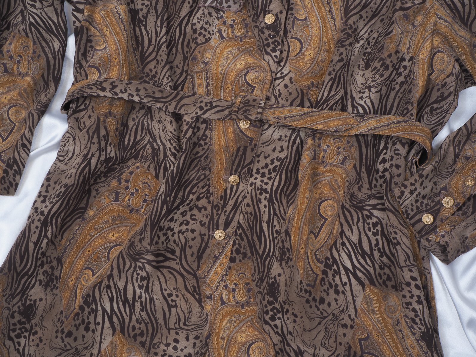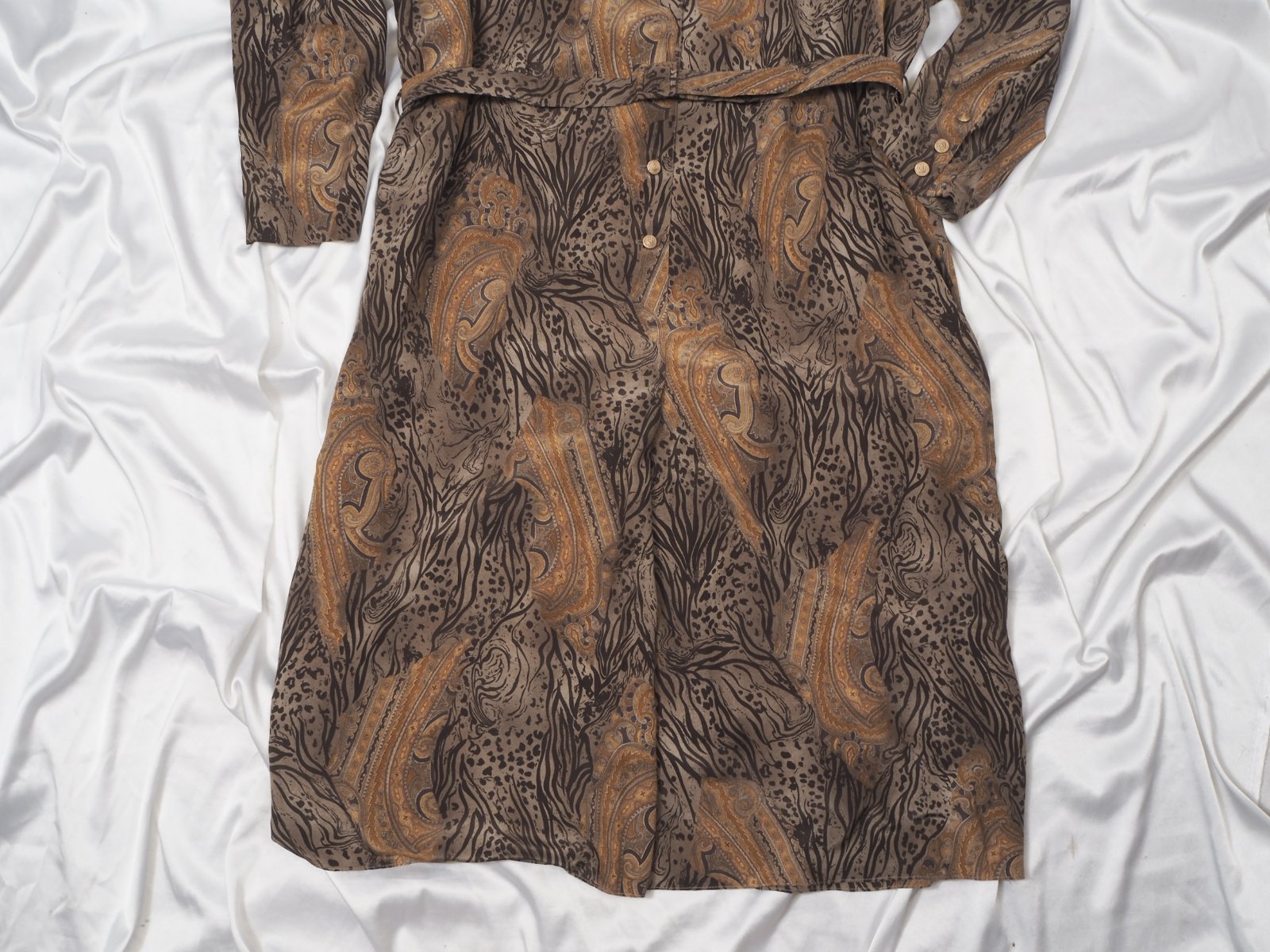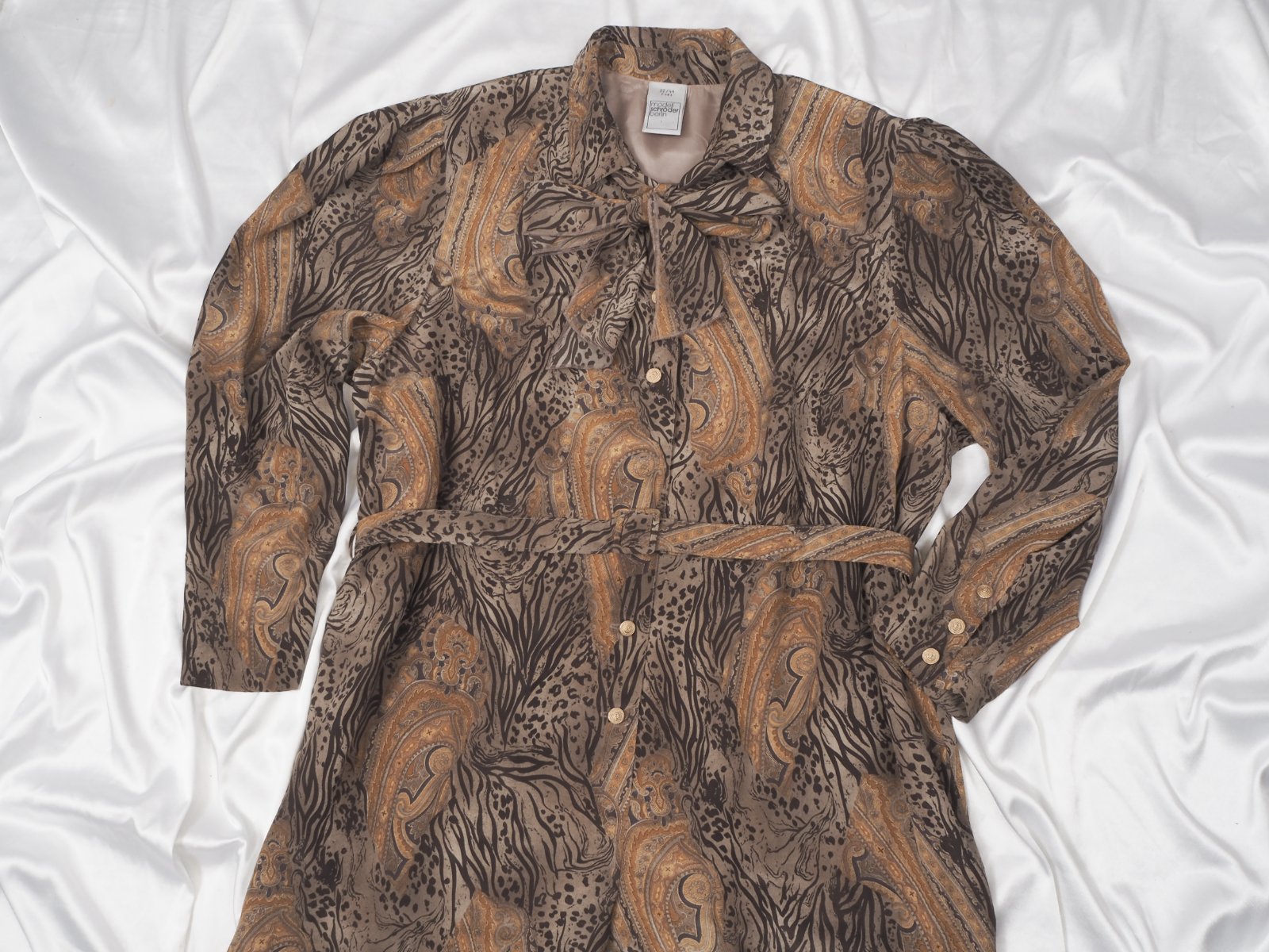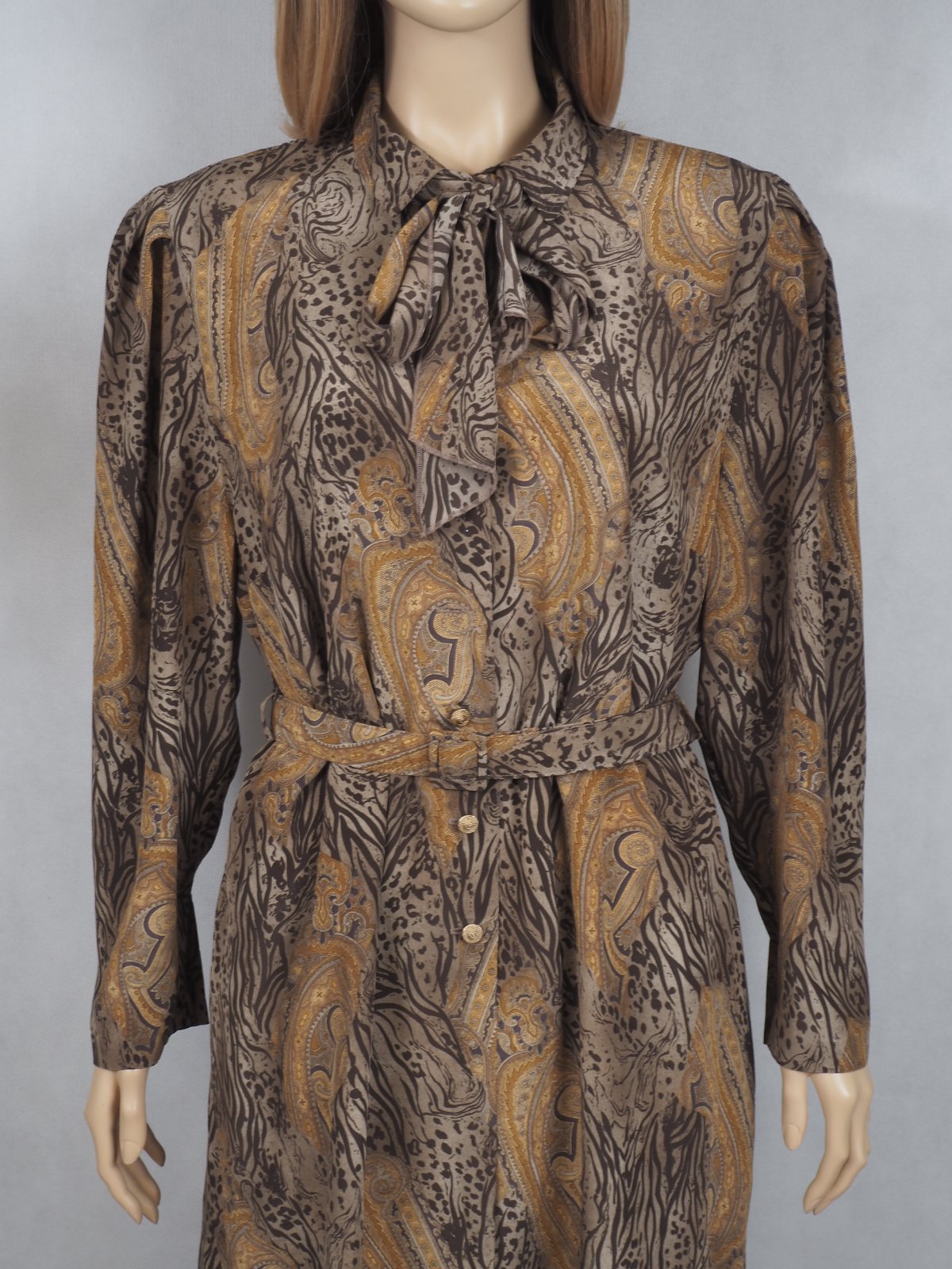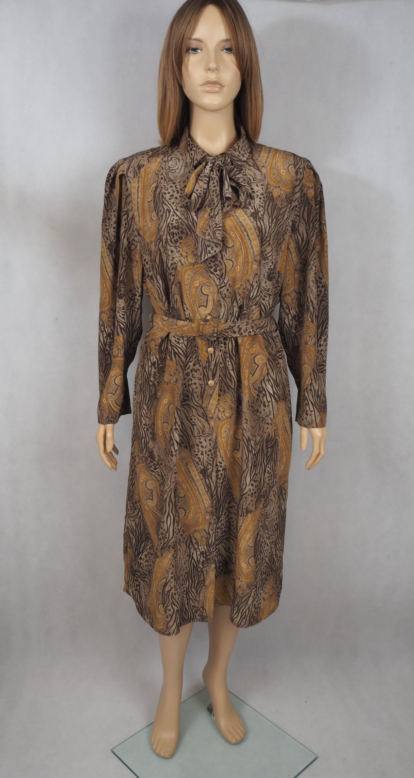 Kvalitné vintage šaty s opaskom a šatkou okolo krku, zapínanie na gombíky do pásu, materiál 100% polyester, sú podšité, super stav.