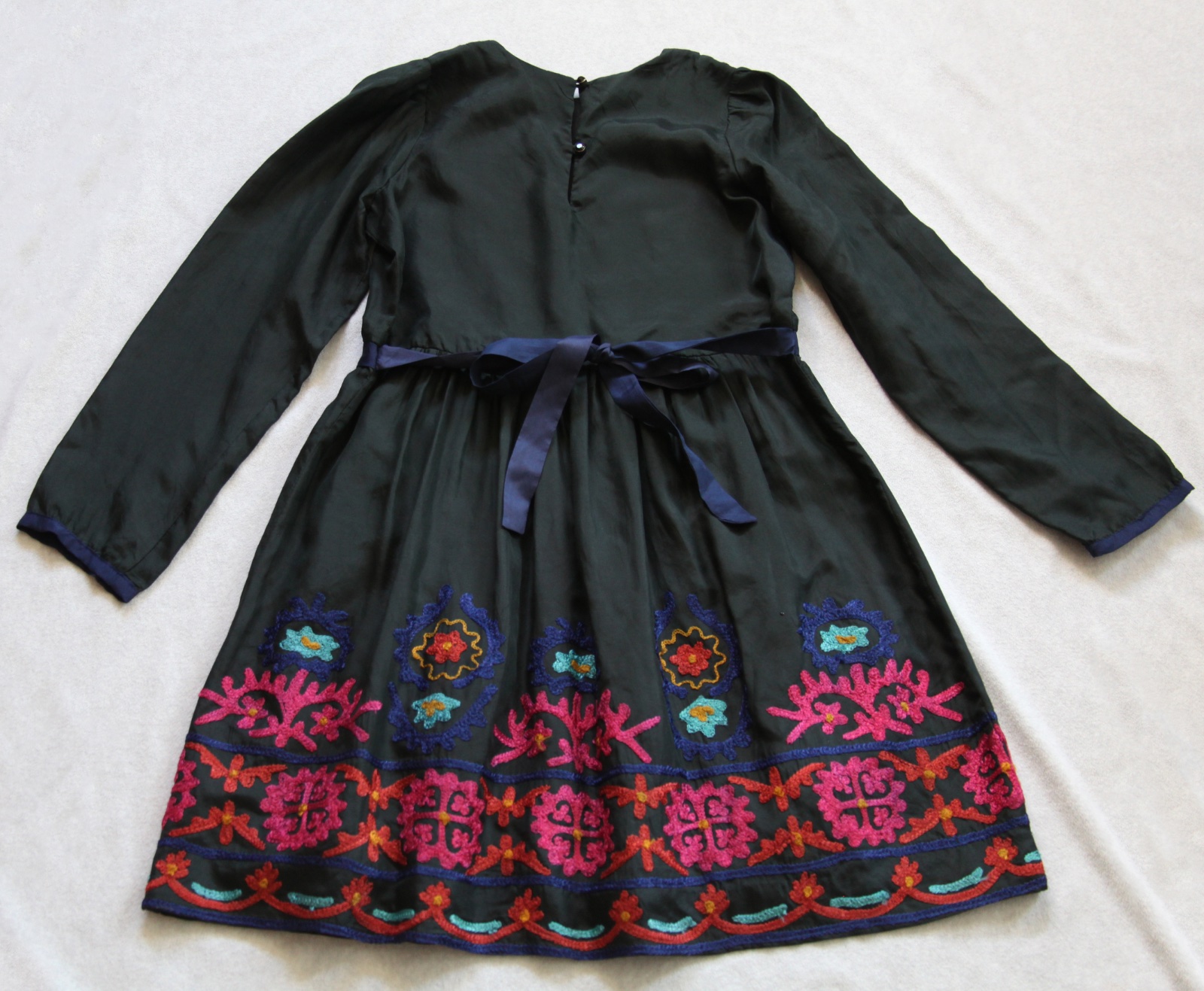 Hodvábne šaty v antracitovej čiernej farbe s kontrastnou farebnou výšivkou. Pre vek 12 rokov. Zapínanie na dva sklenené gombíky vzadu pod krkom. V páse je hodvábny modrý uväzovací opasok. Od pása dole je tenučká bavlnená spodnička v čiernej farbe. Luxusná značka Antik Batik, v super stave, bez poškodení, bez opotrebnia.