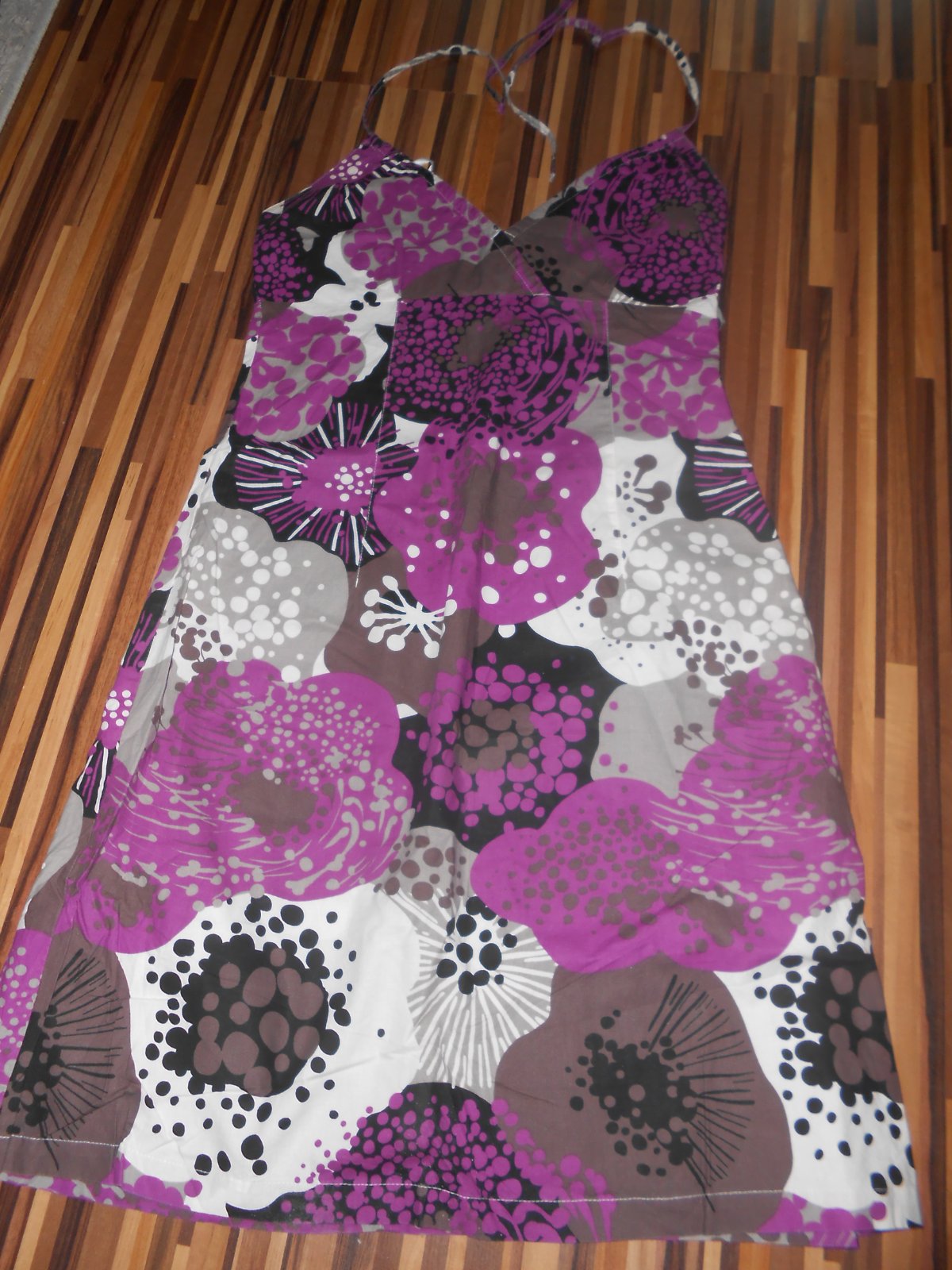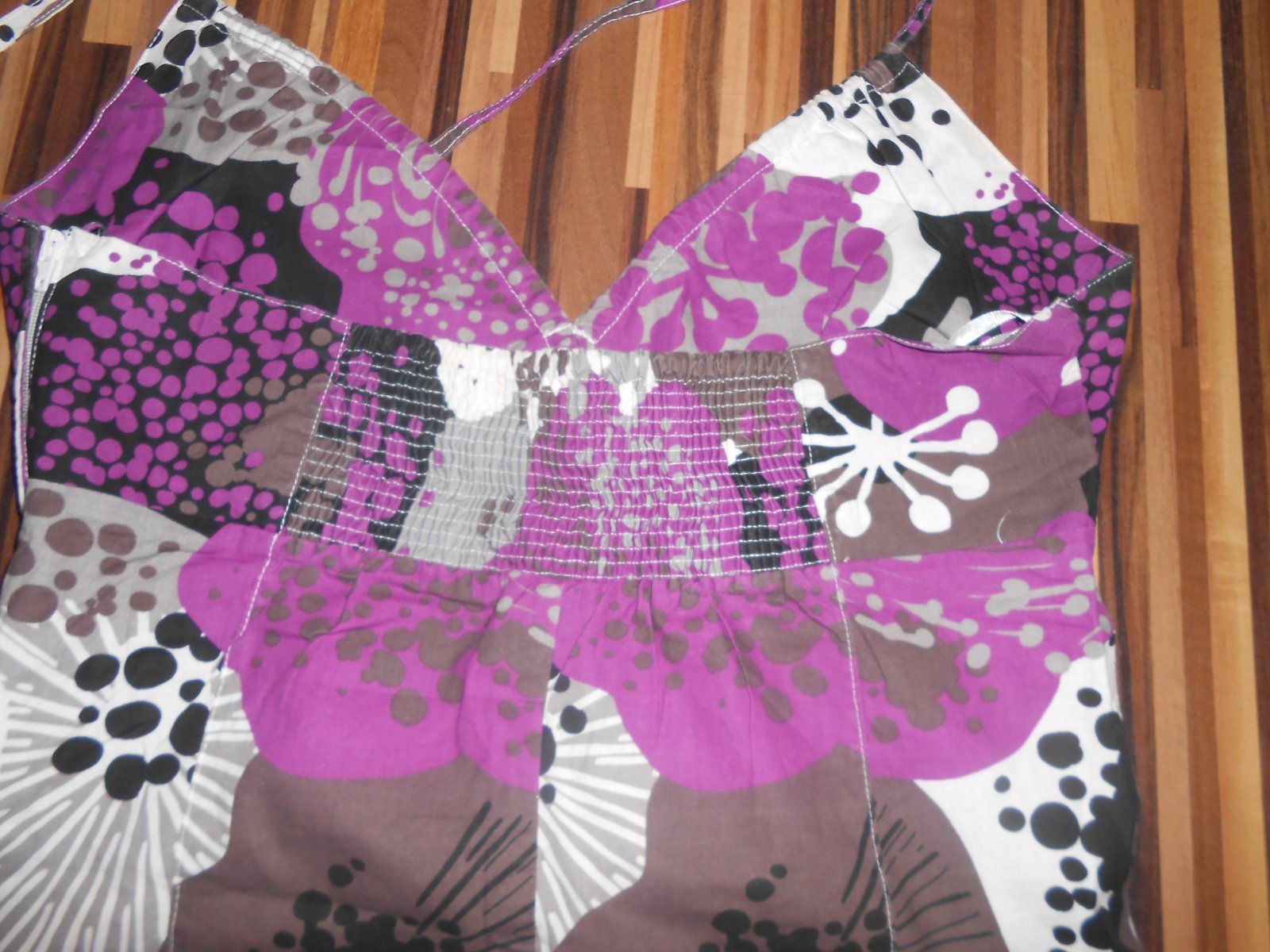 Šaty na leto, 100% bavlna, značka H&M, sedia tak na S-M, úžasné príjemné na telo, z boku funkčný zips, hore na viazanie, šírka meraná pod prsiami 36cm x 2 - vzadu je taká guma (viď foto - čiže sa ešte natiahnu), dĺžka 82cm. Nosené, no bez dier, fľakov, žmolkov. Cena + poštovné. (E)