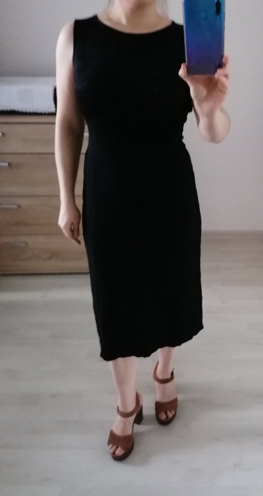 Čierne priliehavé šaty sediace na veľkosť M/L.