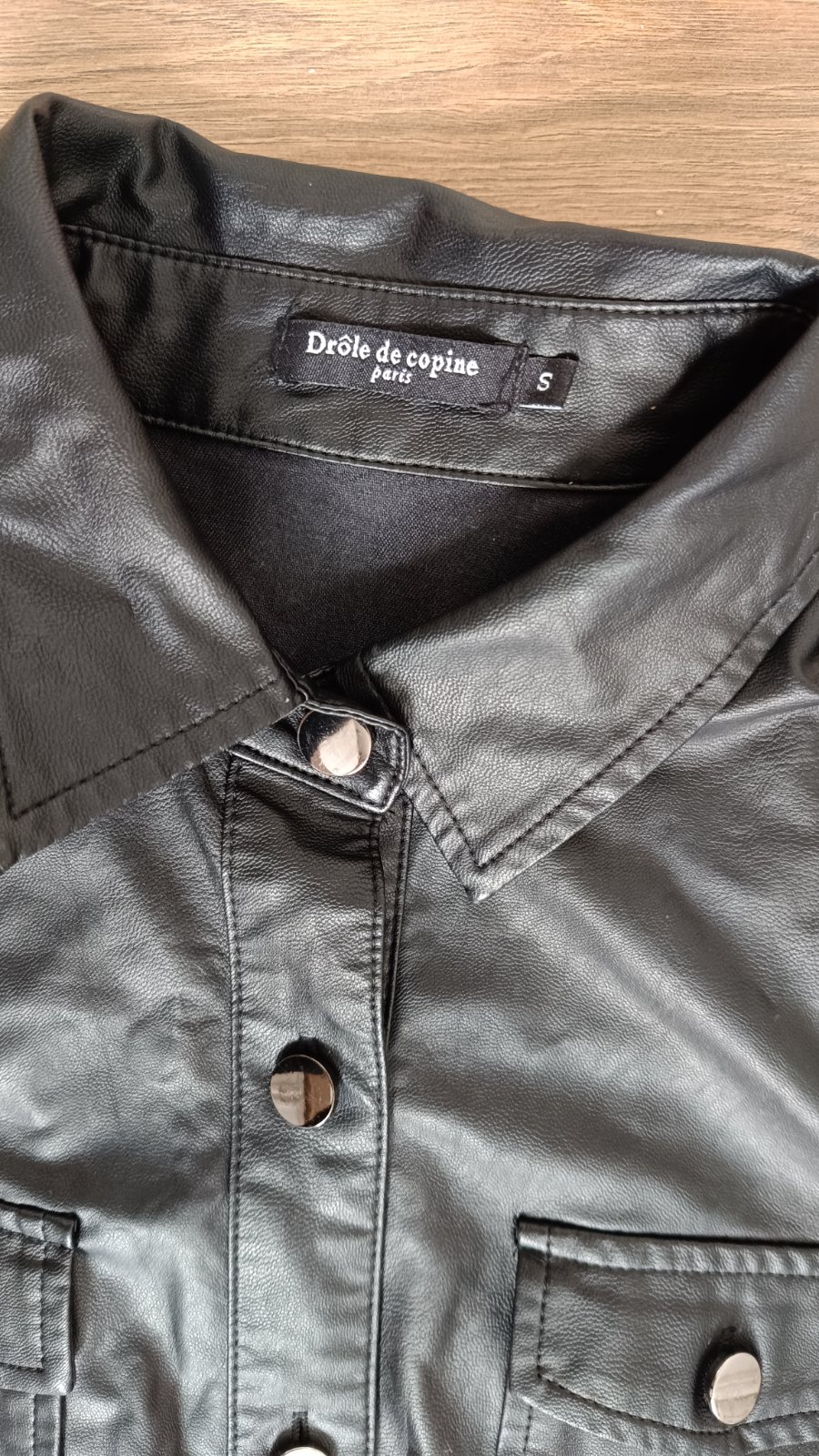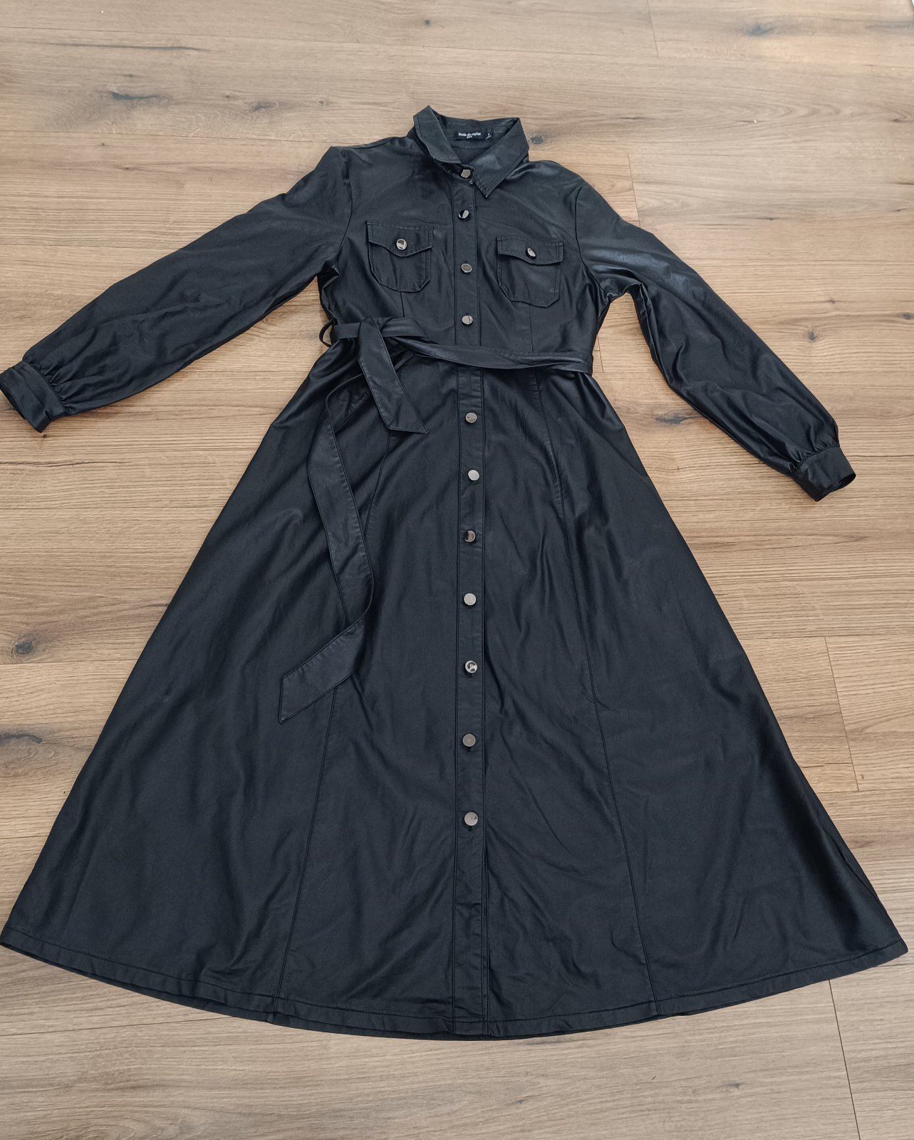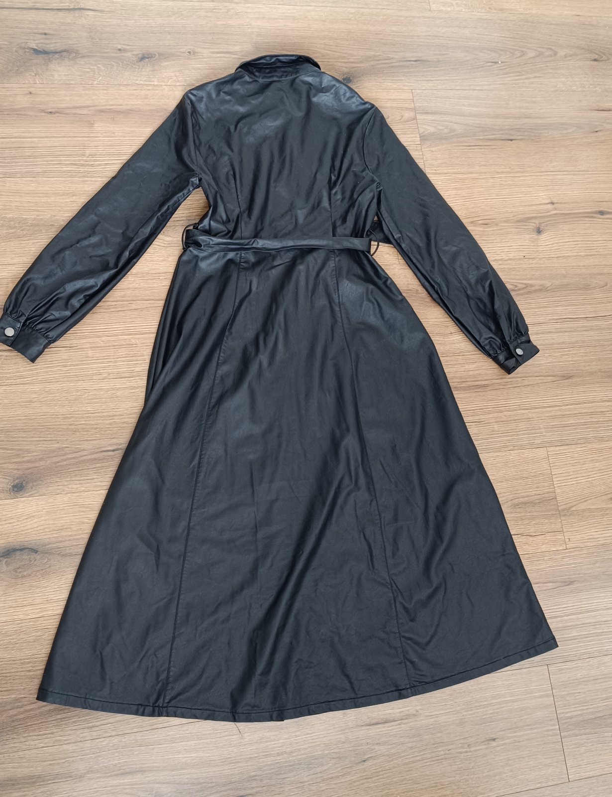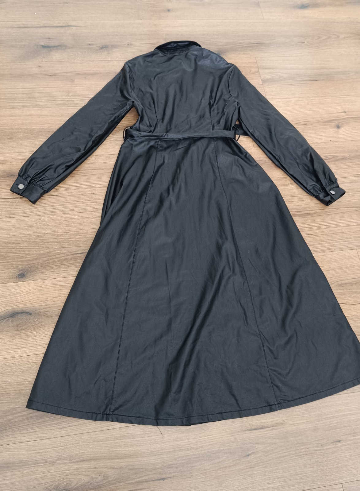 Šaty z ekokože veľ.S.Šaty sú z materiálu polyurethane. Značka Drôle De Copine Paris. Nenosené, nepoškodené. Nositeľné aj ako kabát. Celková dĺžka je 120cm, rukáv 60cm,prsia 2x47cm, pás do 2x41cm.