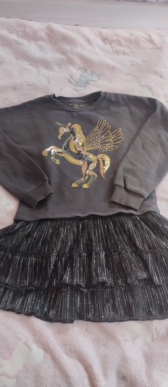 Veľmi príjemné ,mäkké, teplé šaty, s aplikáciou( dá sa pretáčať) , na sukni s čipkou. Skvelé do školy, lebo sú veľmi príjemné. Málinko nosené.