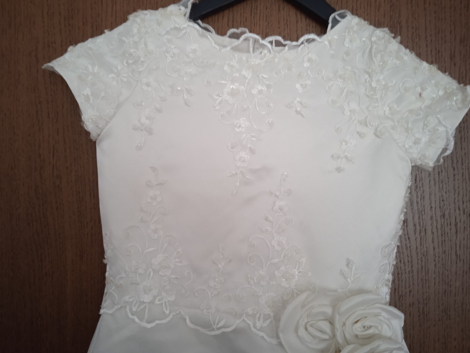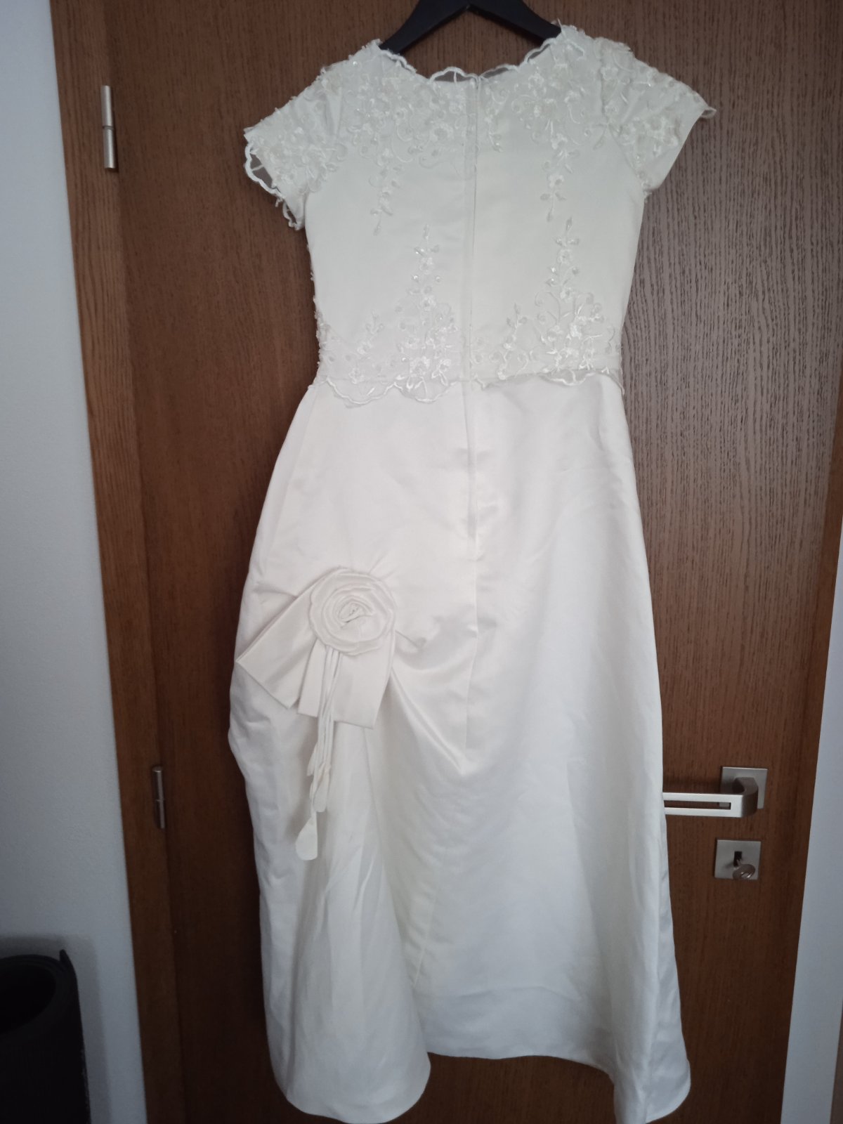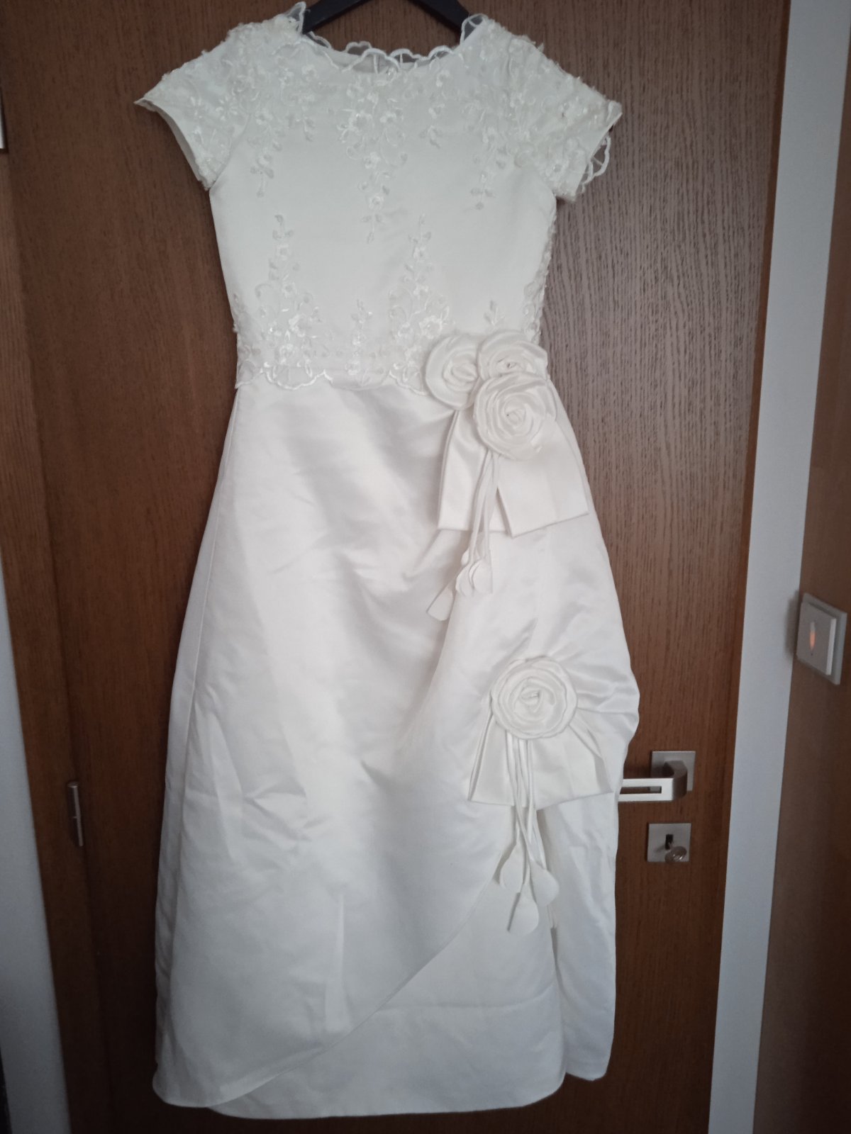 Na mieru kvalitne ṣ̌ité šaty na 1.sv.prijimanie po 1 dietati, rozmery vid foto, vsita spodnicka, vypchávky na rukávoch. V prípade záujmu je možné za 90 EUR mať komplet aj s lajblīkom a kabelkou,foto...