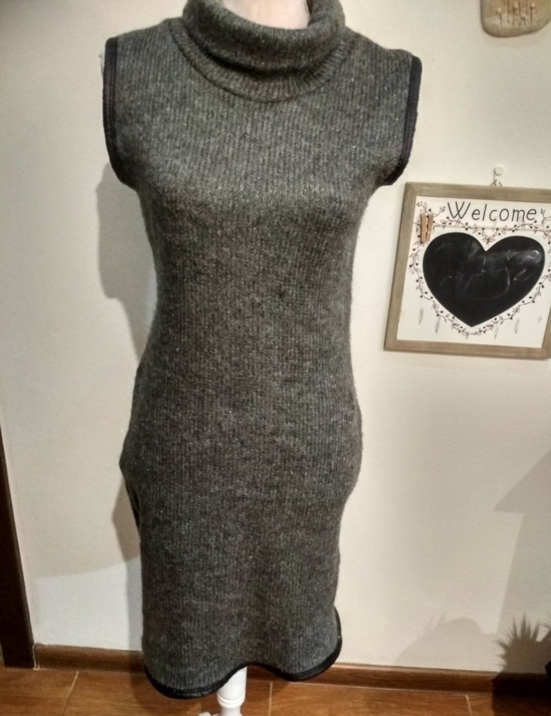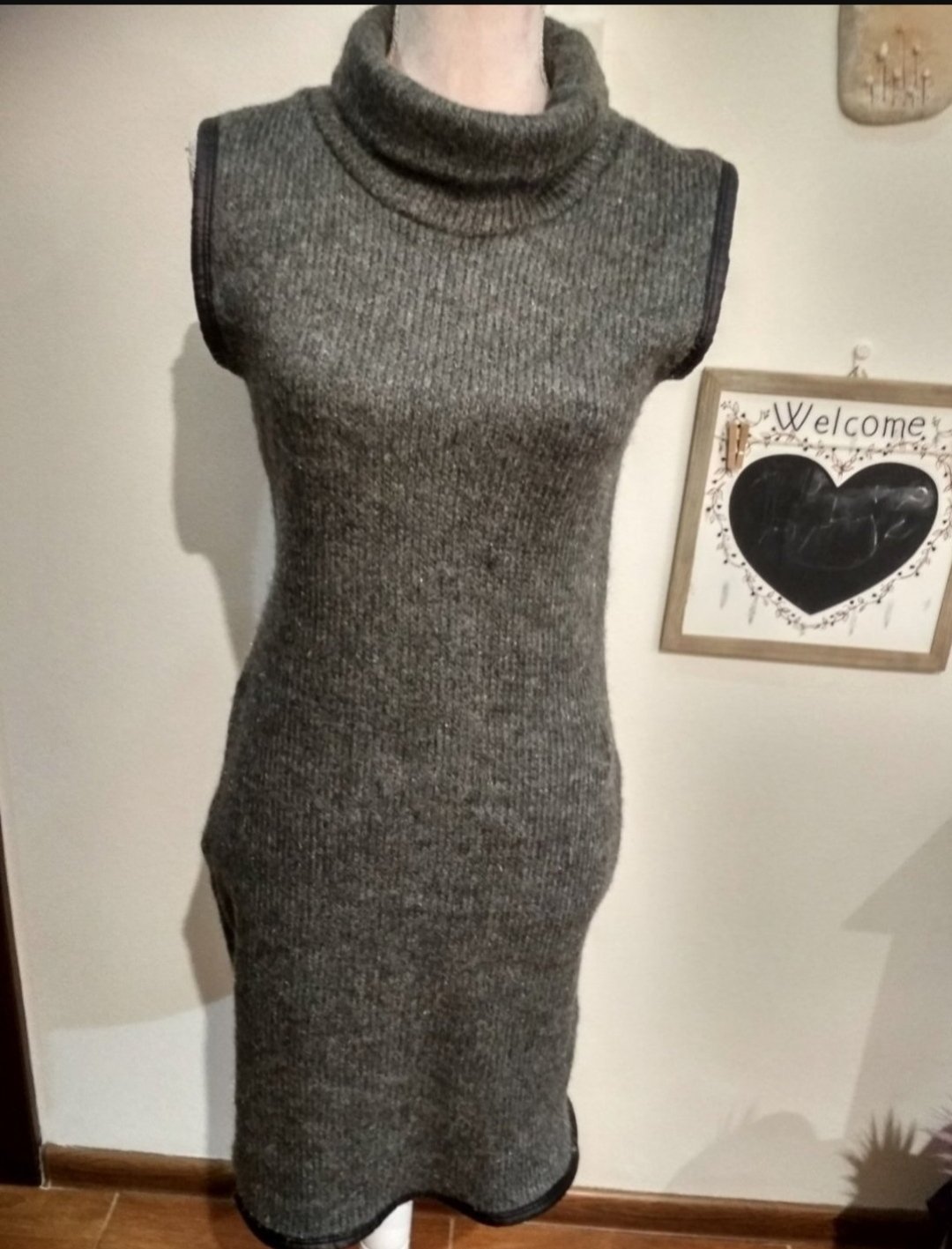 Tmavosivé pletené rolákové šaty s rolákom a bez rukávov, veľkosť S. Materiál pôsobí kvalitne, hrubo pletený úplet pre pohodlné a teplé nosenie v chladnejších mesiacoch. Šaty sú rovného strihu, hor...