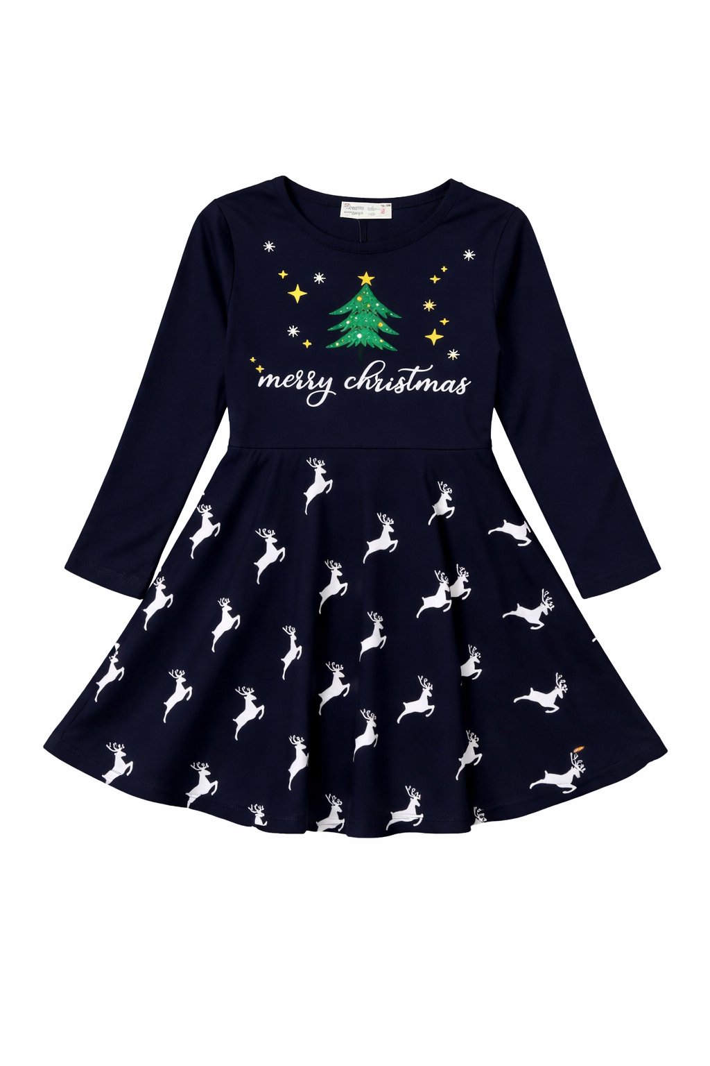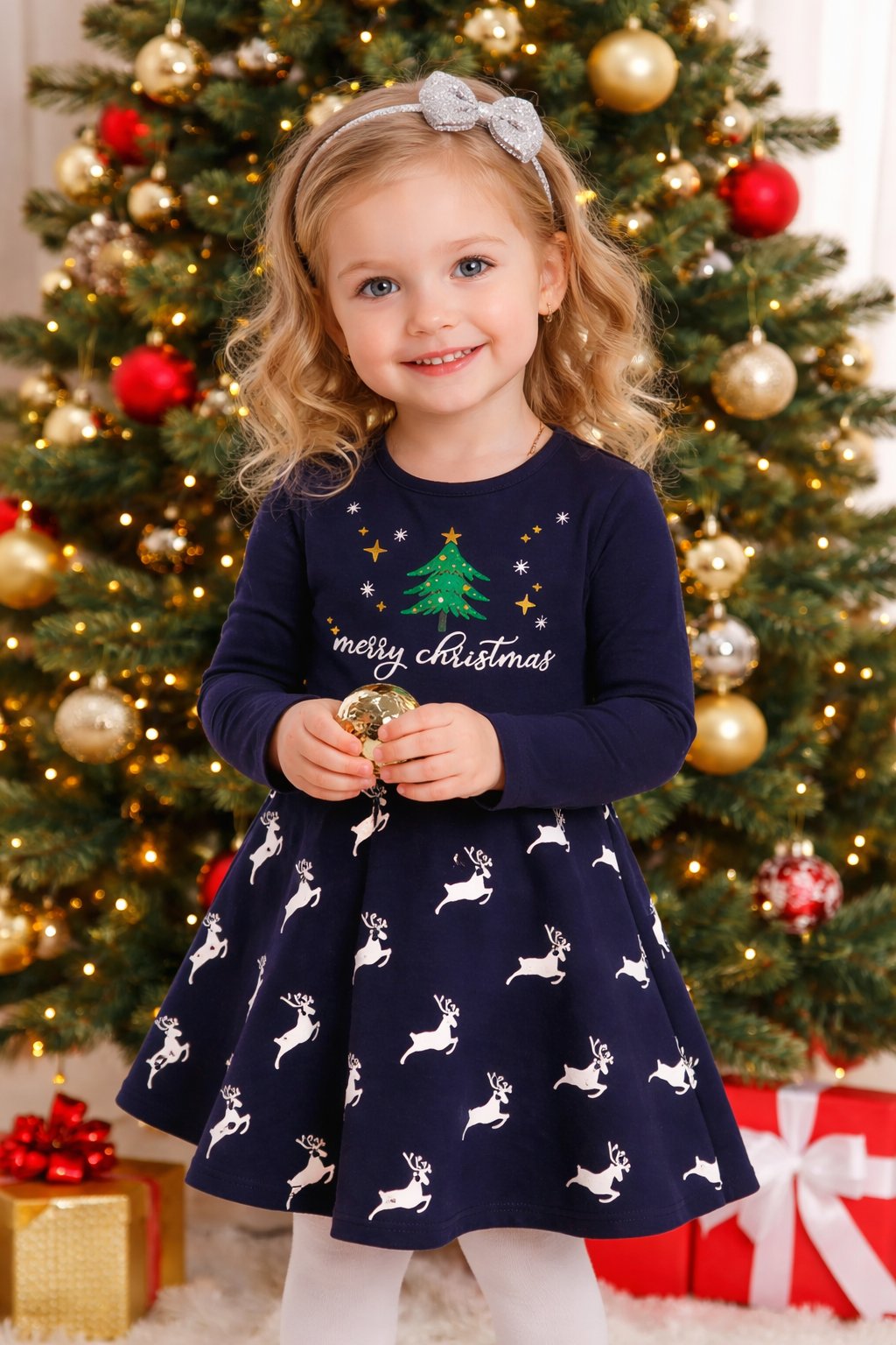 Dievčenské vianočné šaty v tmavomodrej farbe s motívom stromčeka a sobíkov. Pohodlný strih, dlhý rukáv a sviatočný dizajn. Ideálne pre dievčatá vo veľkosti 98 a 104 na Vianoce a rodinné oslavy.Tieto dievčenské vianočné šaty Merry Christmas v tmavomodrej farbe sú krásnou voľbou pre malé slečny vo veľkosti 98 a 104. Vynikajú sviatočným dizajnom, ktorý zaujme na prvý pohľad – vrchnú časť zdobí vianočný stromček s nápisom Merry Christmas, zatiaľ čo sukňa je dekorovaná hravým vzorom bielych sobíkov.