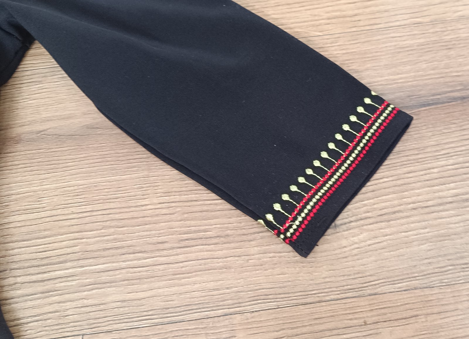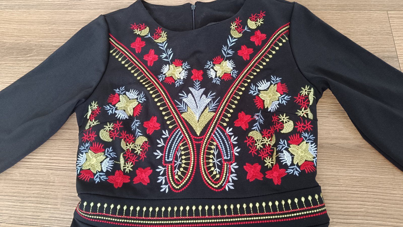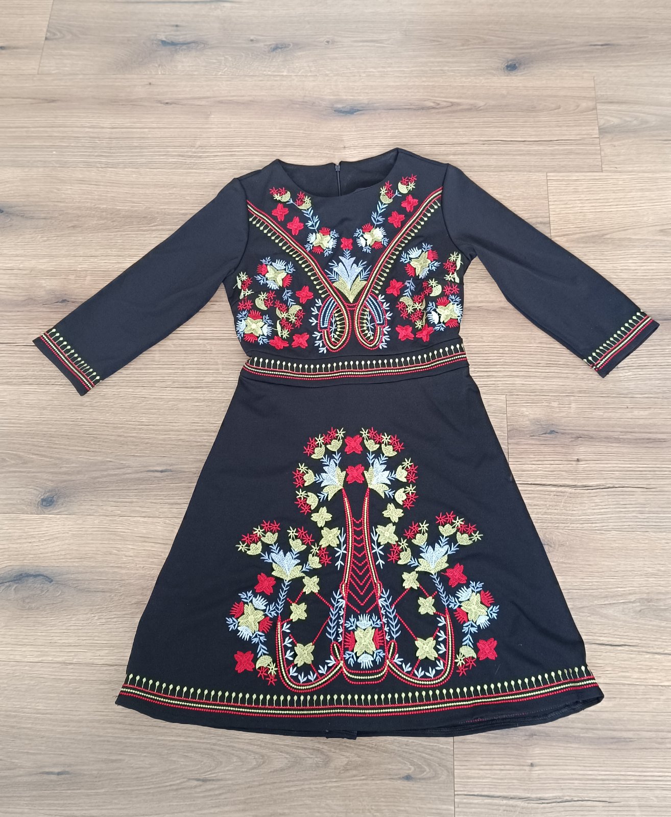 Bohatá ,kvalitná vyšívka šiat folklór štýl. Kvalitná látka,vyšivka je nadherná ,vevytahujú sa nite. Raz oblečené.Celková dĺžka 85cm,pás 2x36cm,prsia 2x42cm...Pevná látka, nie elastická . Trojštvrťový rukáv.