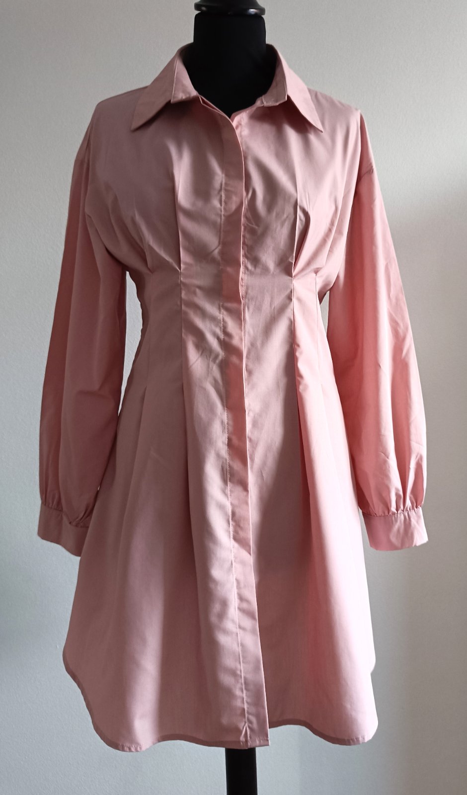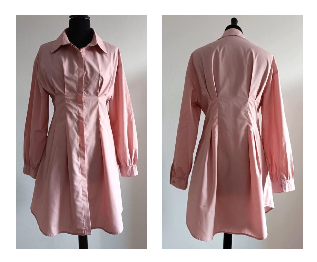 Košeľové šaty, nepružné. Polyester, košeľovina. Hruď 42, pás 39, dĺžka 86, rukáv od krku 72.