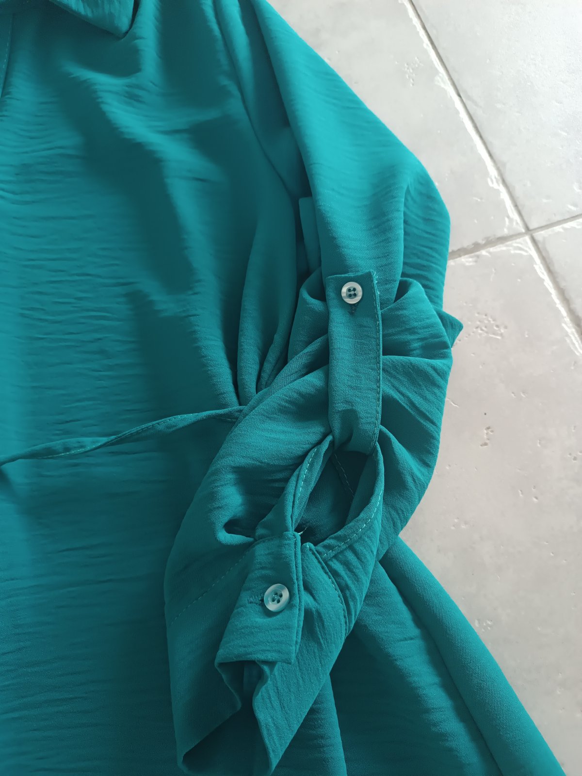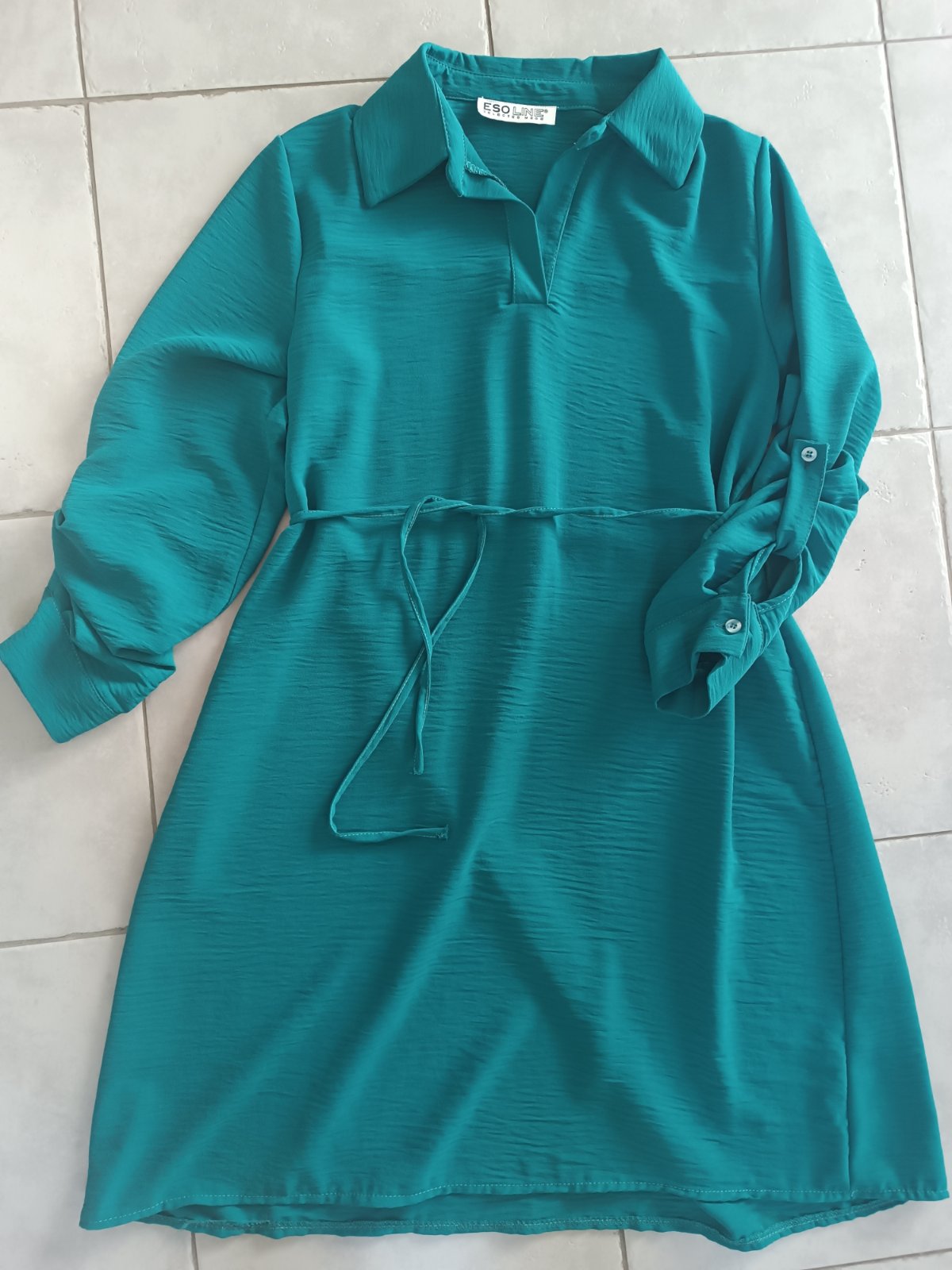 Príjemné, ľahké, vzdušné šaty petrolejovej/tyrkysovej farby. Veľkosť je univerzálna, v páse šnúrka, málo nosené, výborný stav. Zakryje nedostatky ak by bolo treba :) Celková dĺžka 93cm, pás 54cm, rukáv 62cm.