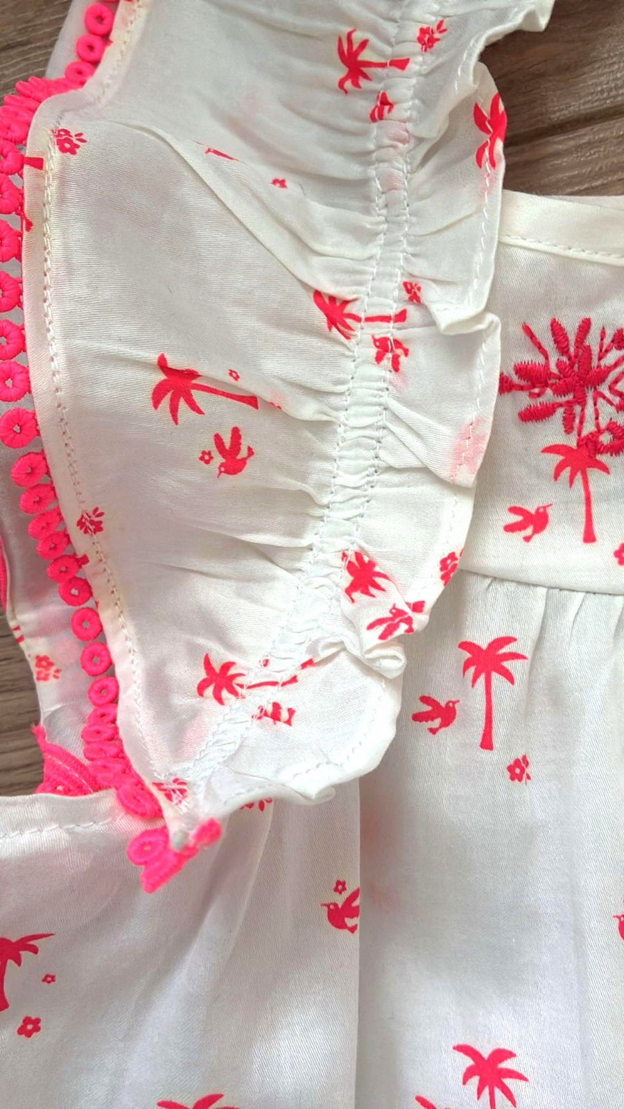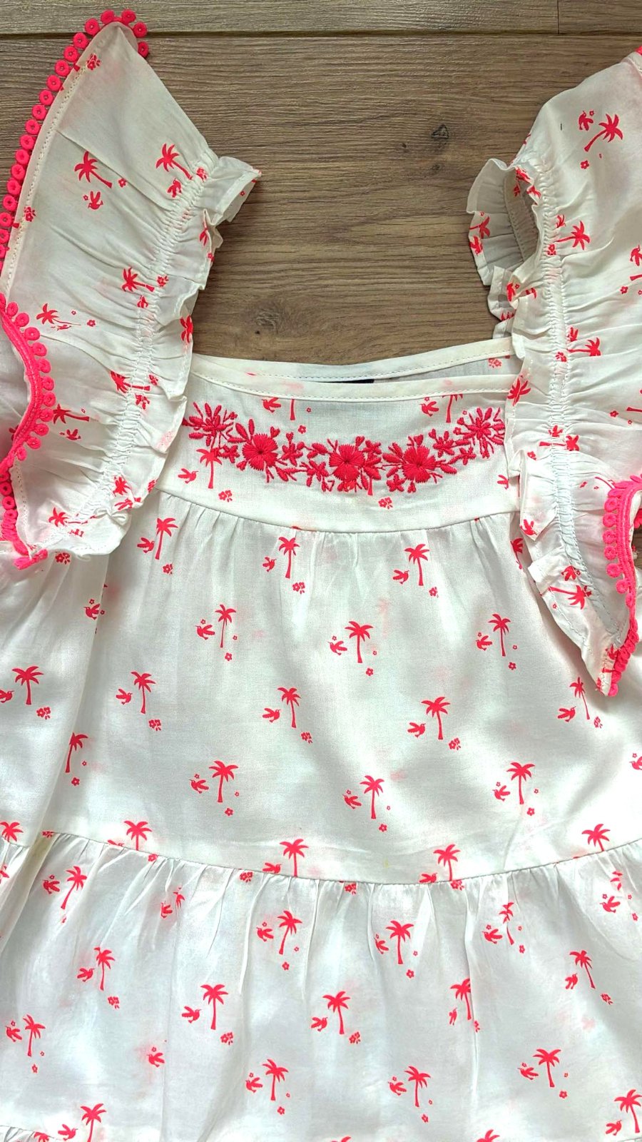 Predám ľahučké letné šaty, majú biely podklad s celoplošnou potlačou ružových paliem, bohato zdobené volániky na ramenách s pružnou gumičkou (prispôsobia sa a "rastú so slečnou", vynosí sa dlhšie ako 1 sezónu), majú kontrastnú výšivku na hrudi, sú nepodšité, ideálny kúsok do najväčších horúčav, strih voĺný, áčkový, obliekanie jednoduché cez hlavu, d=74cm, 100% ĺahká bavlna, nosené minimálne.