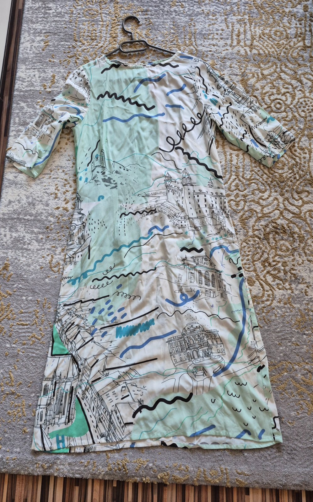 Nadherne, krasny dizajnovy kusok. Na satach su vyobrazene pamiatky Bratislavy. Kvalitny material 100% viskoza. Vyrobene na Slovensku. Vzadu na zips. Velkost S-M, rozmery na fotkach