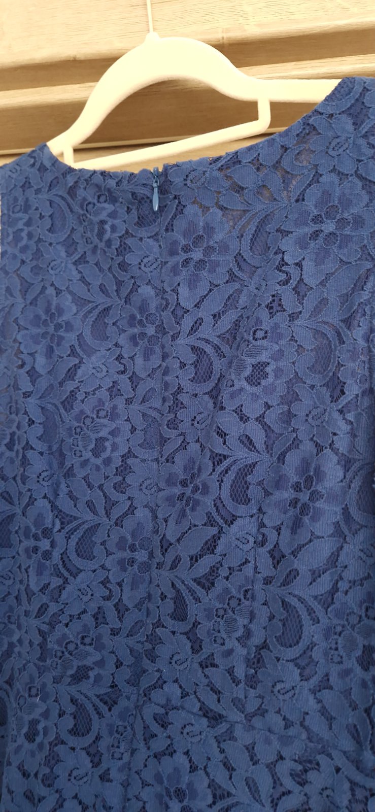 Tmavomodré šaty, teplákovina, potlač bielych motýľov; došitá čipka. Niekoľkokrát nosené, bez poškodení. Veľkosť S.