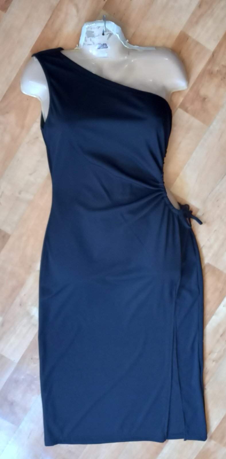 Krásne sýto čierne šaty na jwdno rameno,na ľavom boku výkroj,rázporok,rebrovaný materiál.Top stav