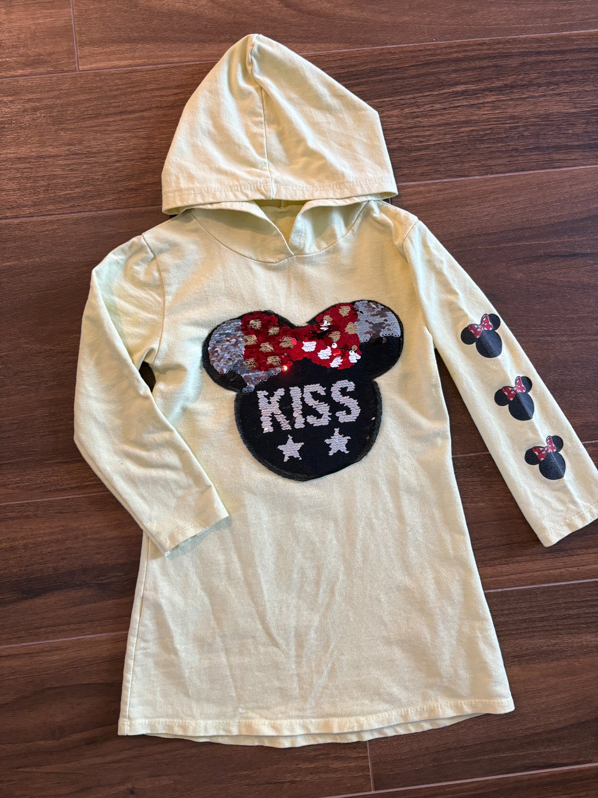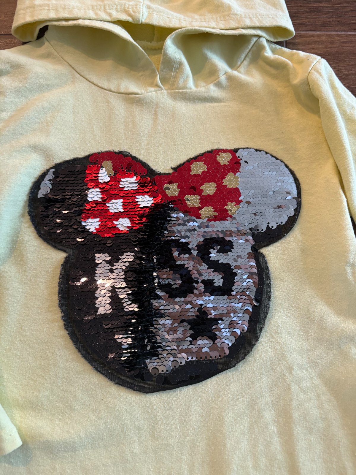 Teplákové šaty/mikina/tričko, bledožlté s kapucňou, flitrovým premieňacím obrázkom Minnie.